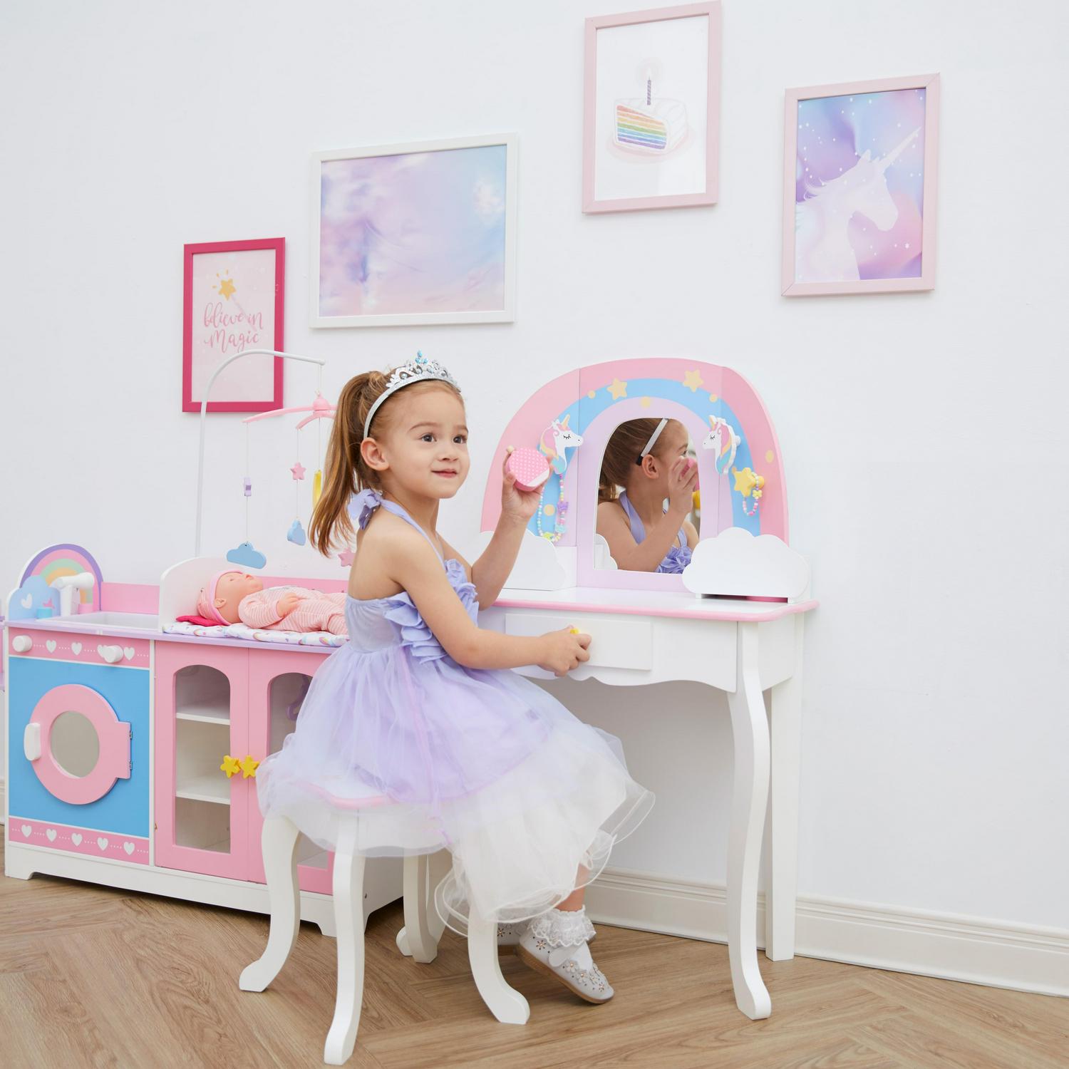 Give your little one a magical place to get ready with the Fantasy Fields by Teamson Kids Little Dreamer Vanity Table with Stool. This whimsical vanity set features a rainbow unicorn design with pink and purple accents for a fun and functional addition to your child’s bedroom or play area. This kids vanity set includes an arch-shaped mirror and coordinating stool to make getting ready easy. The three built-in drawers and star & unicorn shaped hanging hooks on the mirror provide plenty of storage space for makeup, brushes, jewelry, and other accessories. The durable MDF construction with rounded corners is kid-safe and easy to wipe clean from every day messes, and the unbreakable plexiglass mirror provides better reflection and long-lasting use. The easy-to-follow instructions allow for quick adult assembly so playtime can start right away. This kid-sized vanity table measures 23.5″ long, 11.75″ deep, and 38.5″ tall and the stool measures 11.5″ long 11.5″ deep, and 13.75″ tall to fit in any playroom. Recommended for children ages 3 years and up.
