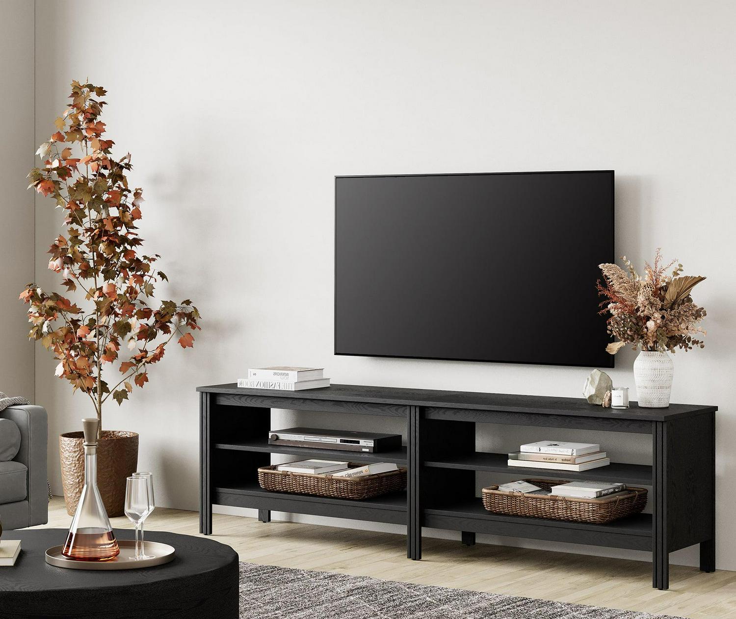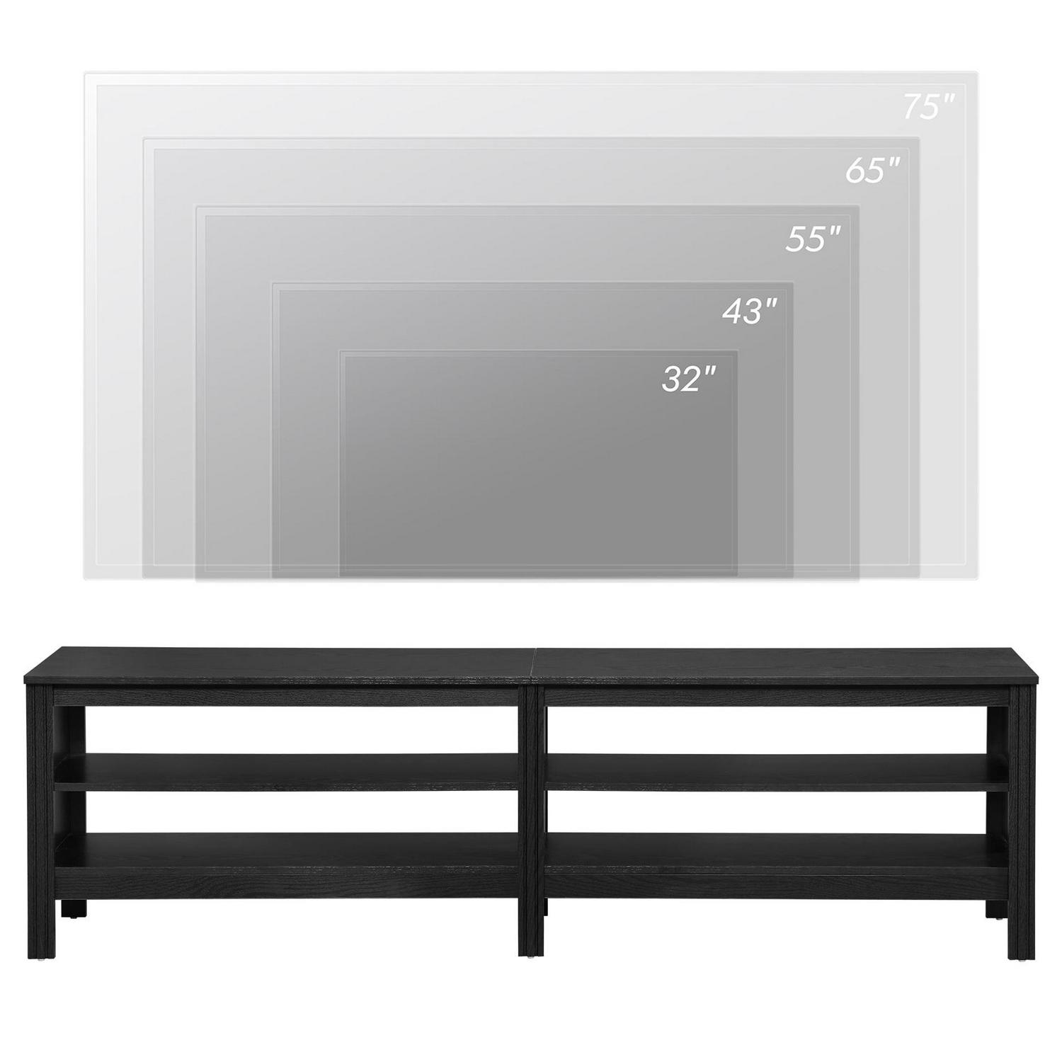 Large Capacity—This TV stand is perfect for TVs up to 75 inch TV.4 open shelves with big capacity allow you to storage the books, magazines, CDs and any other media or gaming devices.
