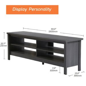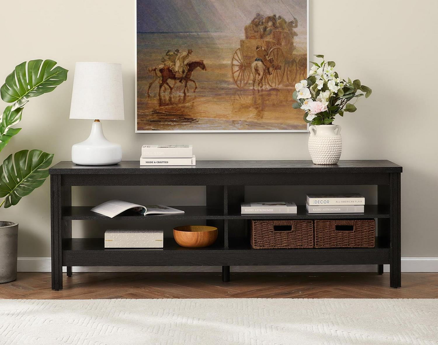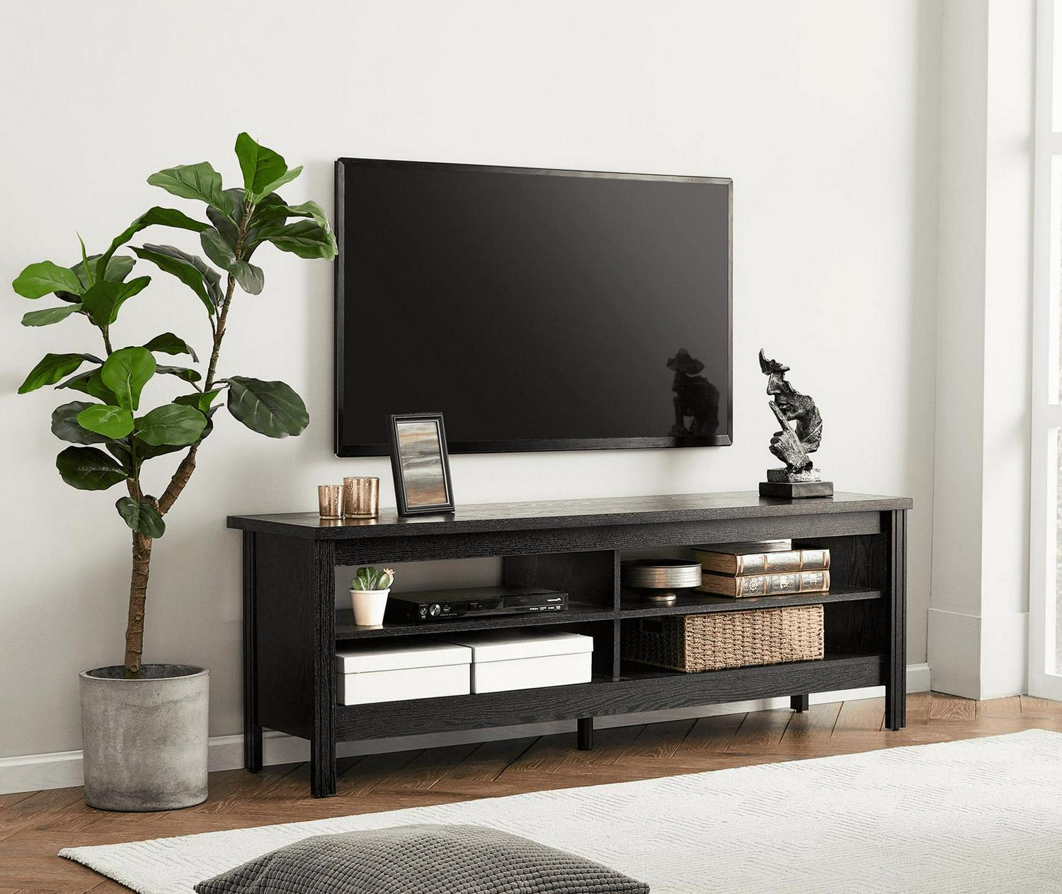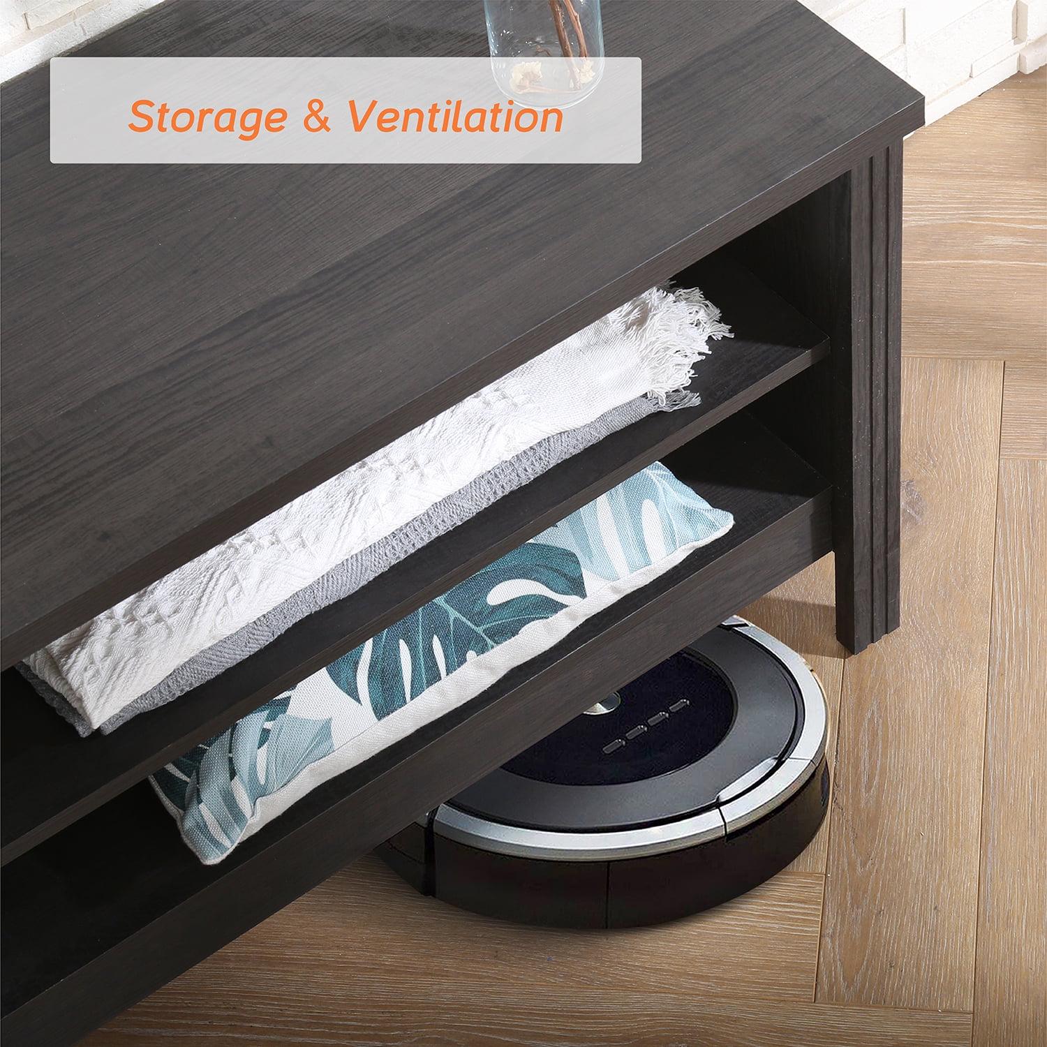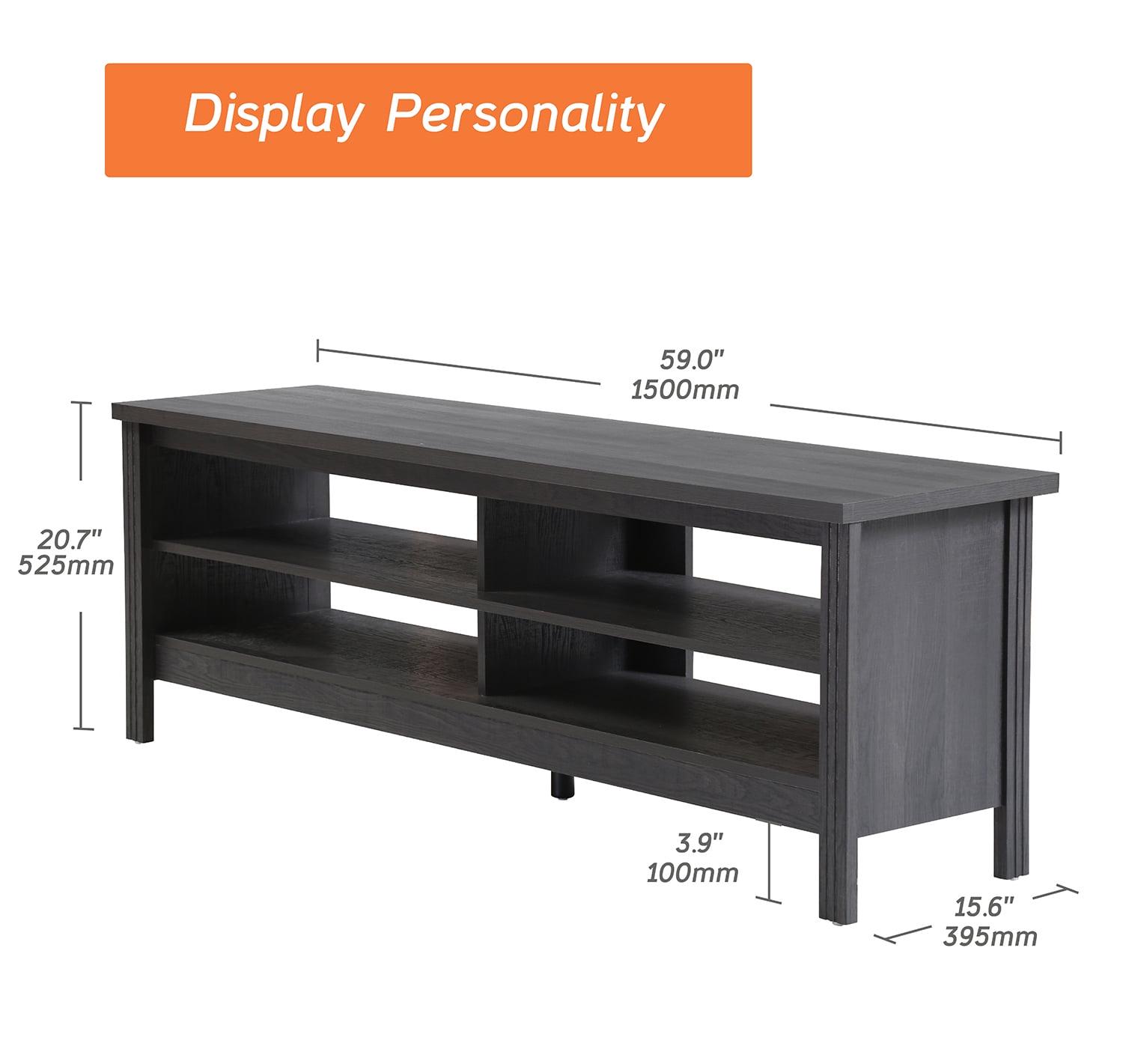 TV Cabinet / TV Table / Entertainment Center TV Unit: Farmhoues Design & Multifunction—The black wood grain and simple lines on this entertainment stand make it look classic and elegant. It can be not only used as TV stand, also perfect for sofa table, hallway Table, entry table, entertainment center, media stand, storage console table, etc. Large Capacity—This TV stand is perfect for TVs up to 65 inch TV.4 open shelves with big capacity allow you to storage the books, magazines, CDs and any other media or gaming devices. Stable Structure& Easy To Clean–Made from high-grade certified MDF for long-lasting construciton.Rich brown wood grain finish is easy to clean.And its smooth waterproof surface is easy to clean with a soft damp cloth to facilitate your daily cleaning work. Accessible for Robot Vacuum Cleaner—The tv table is 3.9 in high height off the ground which adequate for robot vacuum cleaner can passing freely. No more headaches from dust under the cabinet. Easy to Assemble & Dimension—With detailed instructions and all hardware delivered, the wood TV stand for 65 inch TV is effortless to assemble.Dimension 60″ L * 15.5″ W * 23.6″ H.Max load capacity: 175 lbs.