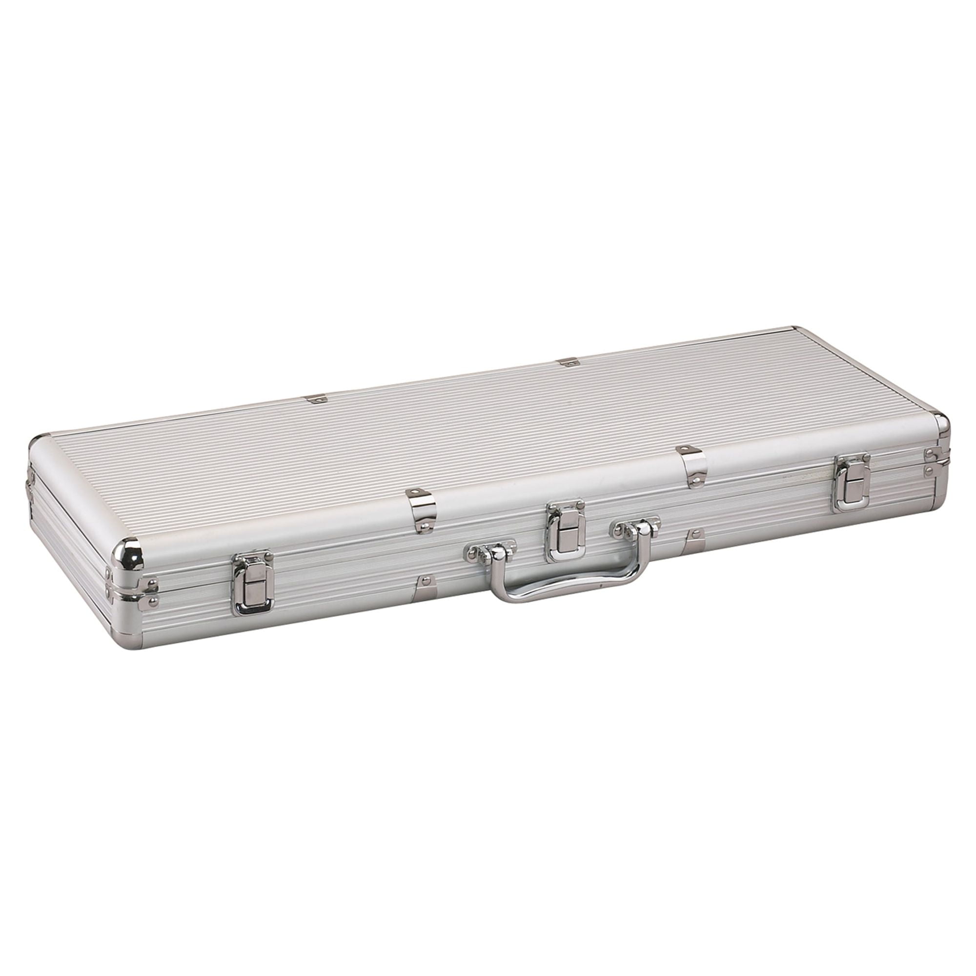 Complete set of 500, 11.5g Claytec, striped poker chips of a wide range of colors. Two decks of standard playing cards are included for quick games ready to play out of the box. Includes all the accessories to host an official game: a full set of Big Blind, Little Blind, and Dealer buttons. Housed in a tough aluminum case with foam cushioning inserts to protect your chips from impacts and elements alike. Include a full set of poker dice for a change of pace – a fast paced game that is growing in popularity.