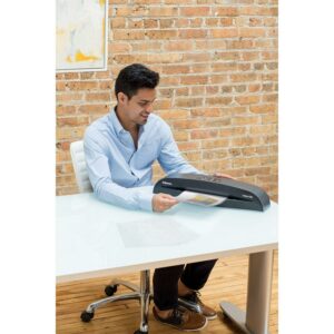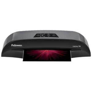 Fellowes Callisto 95 features hot swap Technology allowing users to change between different pouch and document thicknesses without waiting. Hot lamination for 3 or 5-mil pouches as well as cold pouches. The reverse mode disengages pouch for re-centering or removal. The unique Heat Guard Technology keeps heat inside so laminator is comfortable to touch. Accommodates multiple document sizes. Improved rapid 1 minute warm-up with Instant Heat Technology gets you laminating sooner. Rapid laminating speed up to 19″/minute. Pouch Tracking System detects and alerts the user if there is a misfeed and will automatically reverse the document until the jam is cleared. Auto shut-off prevents overheating when not in use. Includes laminating starter kit.