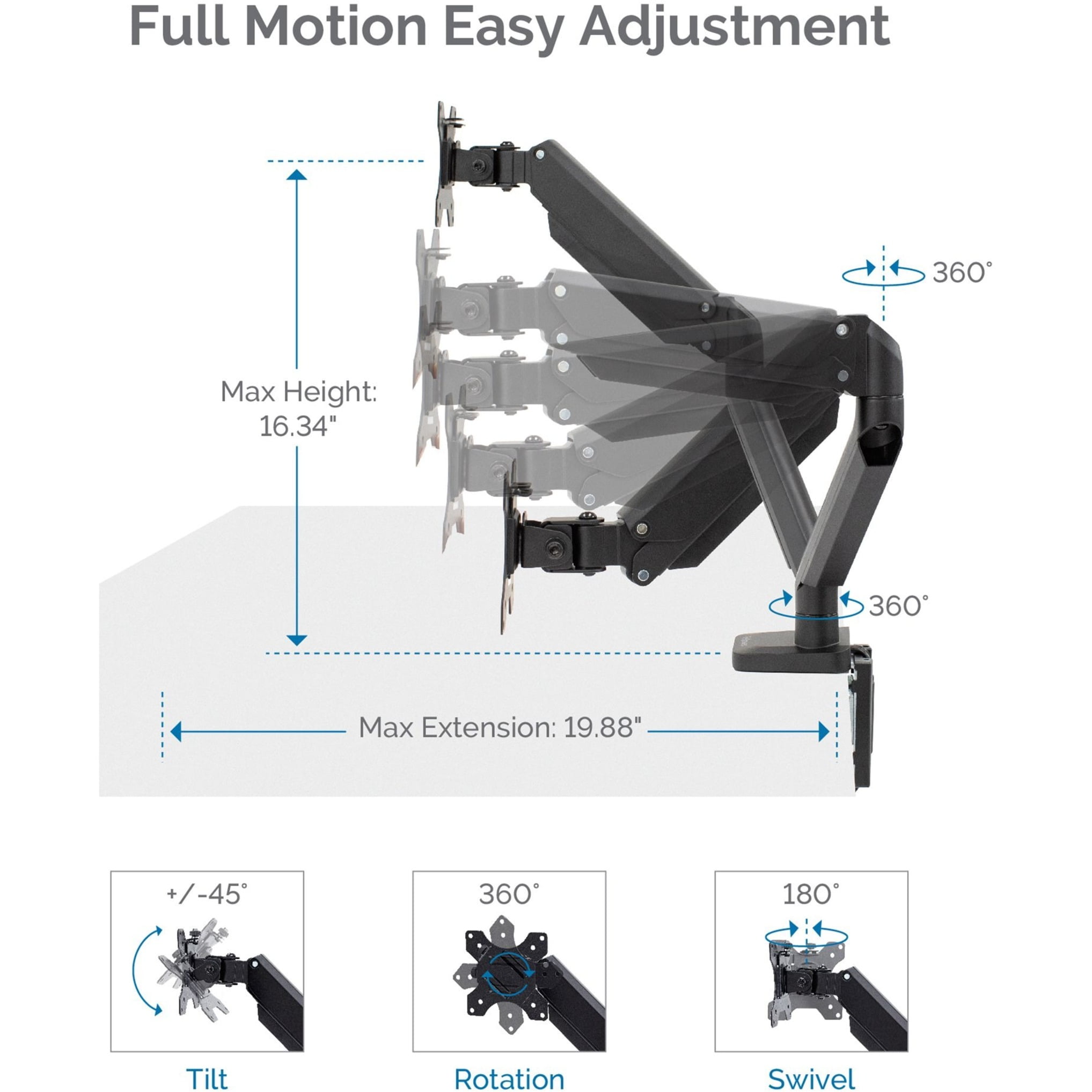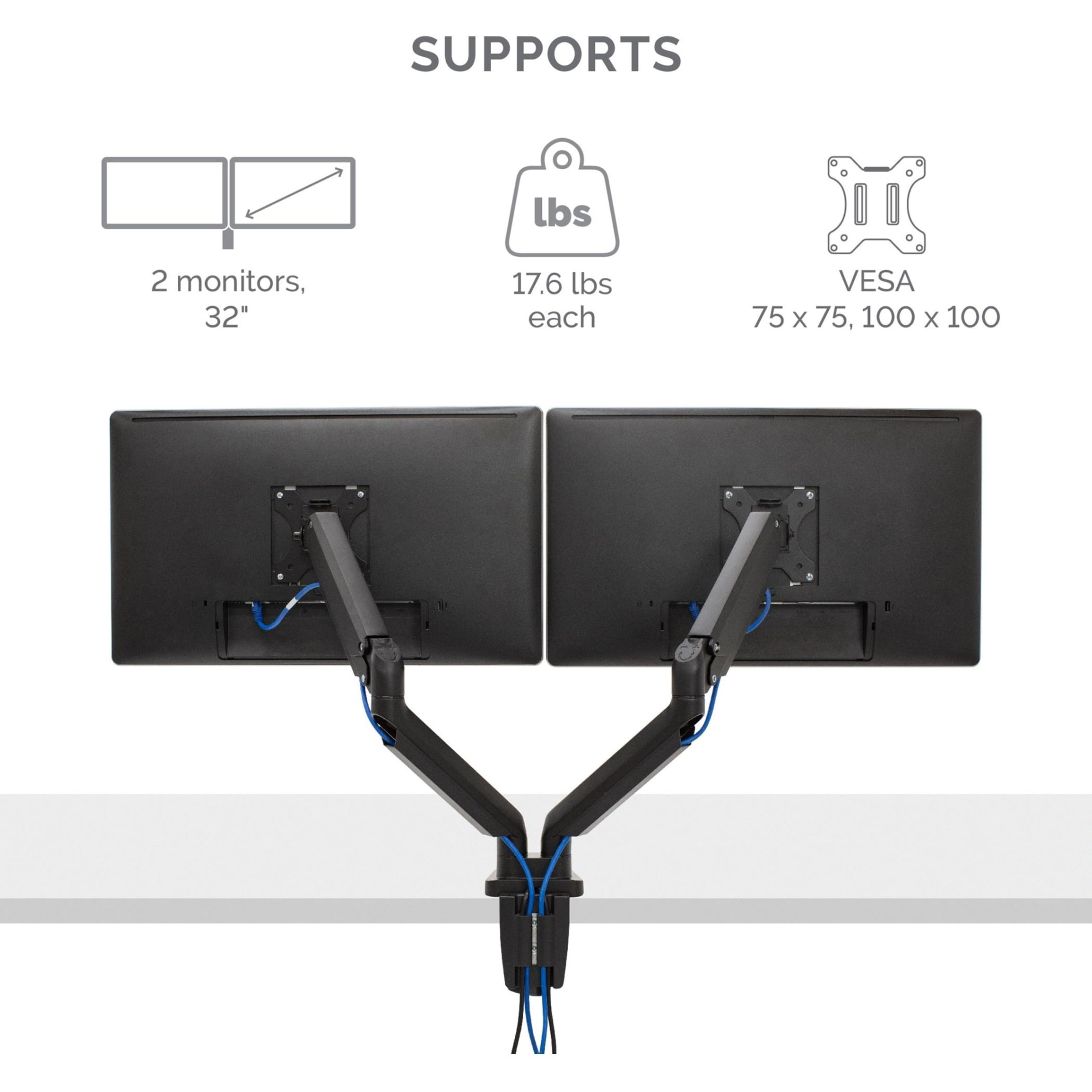 Effortless adjustment with innovative gas spring technology Stay charged with two convenient USB charging ports located at the base of the product Innovative cord management system reduces clutter Easily mounts to any desk between ½” and 3¼” thick or grommet hole between 3/8″-2-3/4″ Holds two monitors 27″/20 lbs each Meets VESA mounting standards Quick fit VESA plate simplifies monitor installation