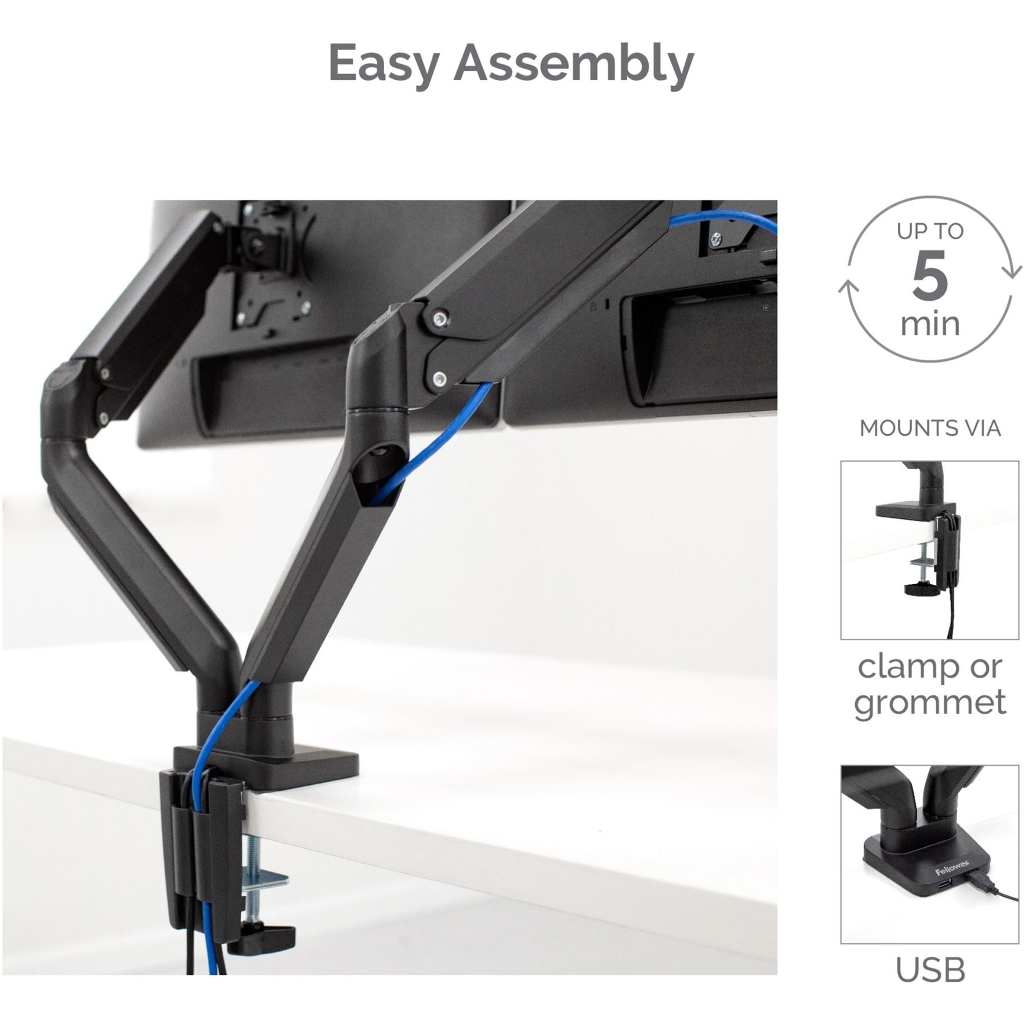 Platinum Series Dual Monitor Arm features two fully independent, adjustable monitor arms for the ideal positioning of your monitors. Innovative gas-spring technology allows effortless monitor adjustment. Intuitive cord-management system helps minimize clutter. Two USB ports located at the base of the product make it easy to connect your favorite devices. Monitor arms are easy to mount. Use a clamp or grommet. Each arm holds a monitor up to 20 lb. It meets VESA mounting standards. Fellowes Platinum Series Dual Monitor Arm, Black