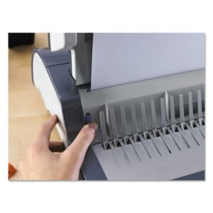 Designed for the binding needs of medium to large offices, the Fellowes Quasar + Comb Binding Machine offers the ideal blend of performance and style. This machine manually punches up to 25 sheets at a time and binds up to 500 sheets with a 2 comb. Vertical document loading ensures accurate punch alignment. Efficient design allows user to punch and bind in a continuous manner. Features built-in comb storage tray with document measurement device for added convenience and quick set-up. Adjustable edge guide centers documents with ease. Includes binding starter pack.