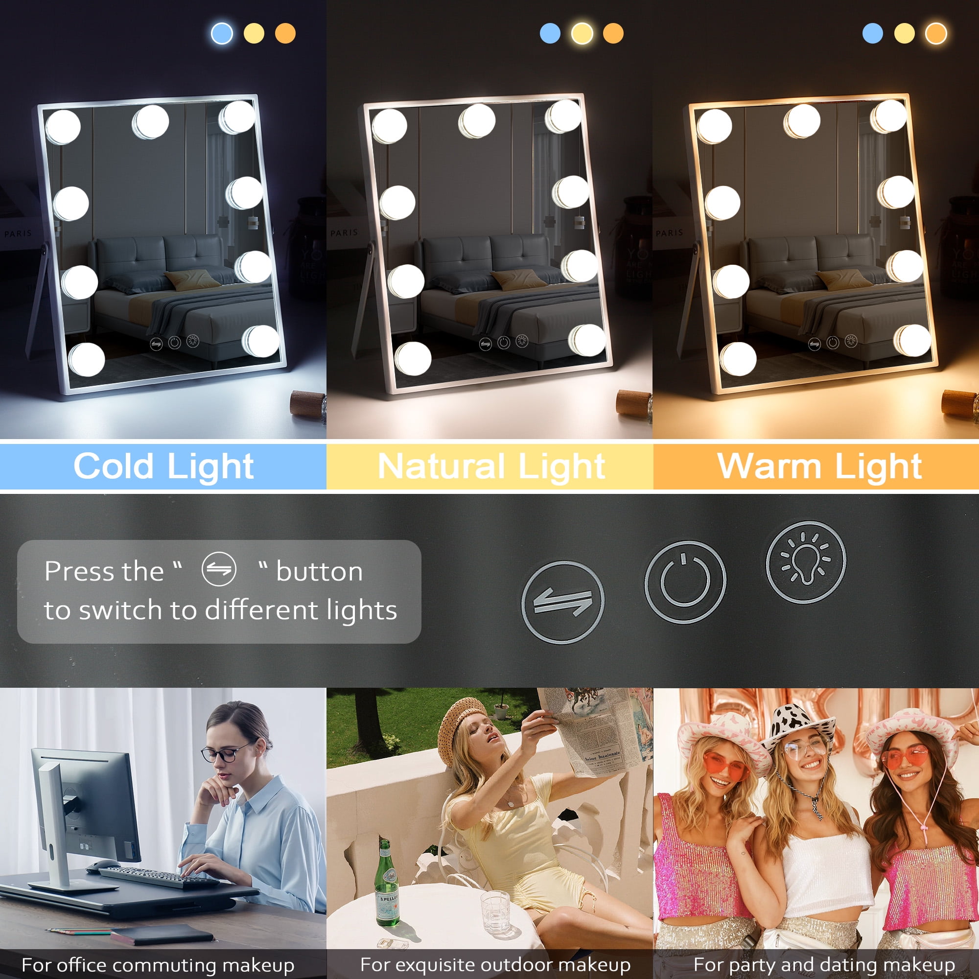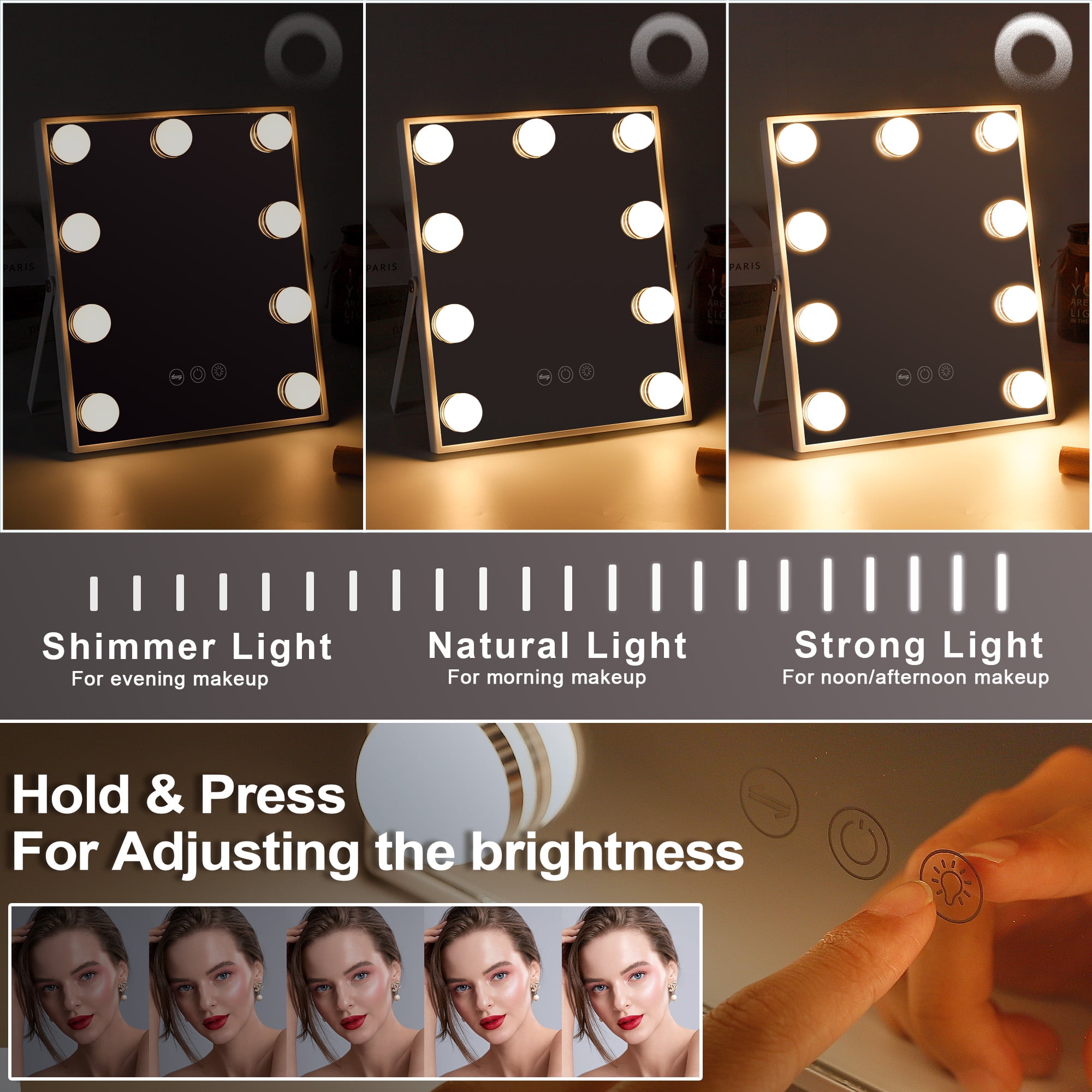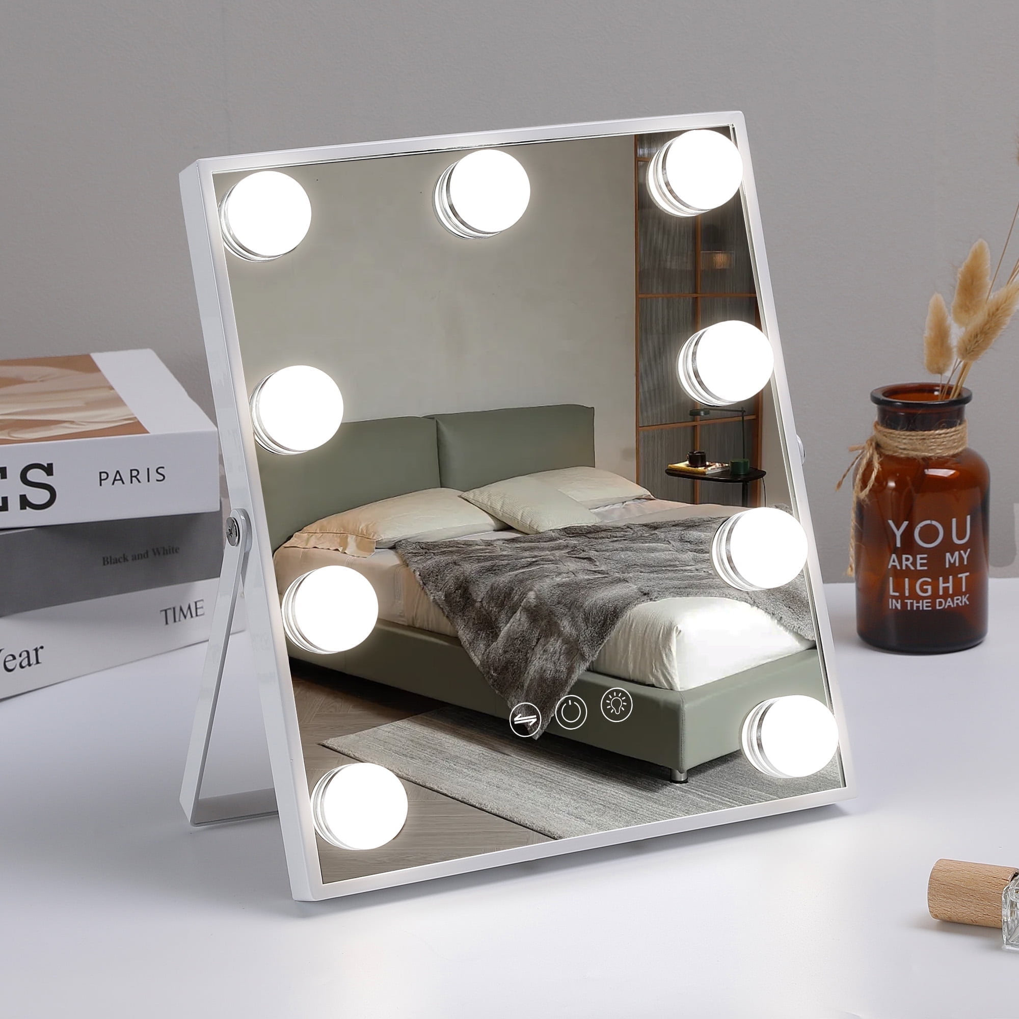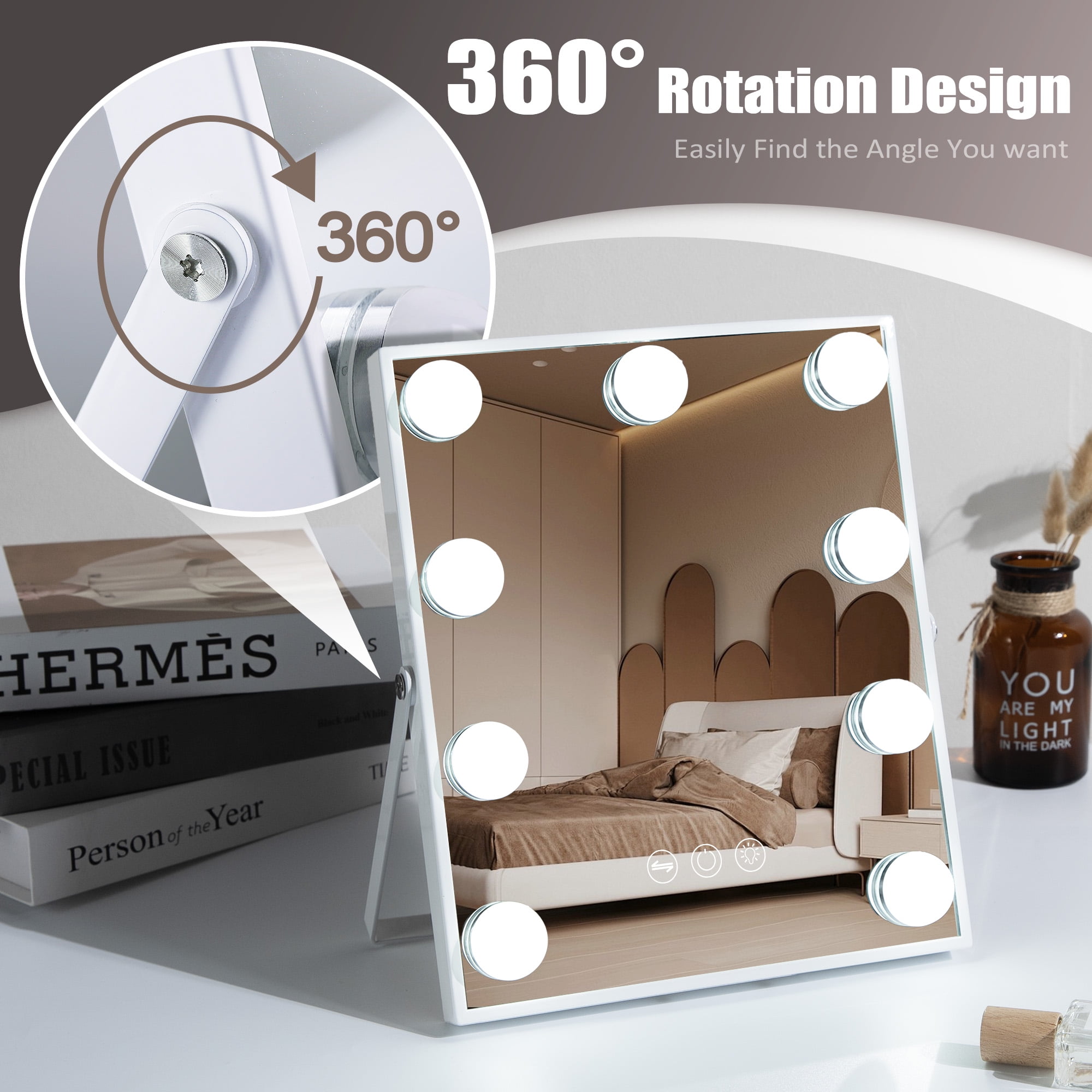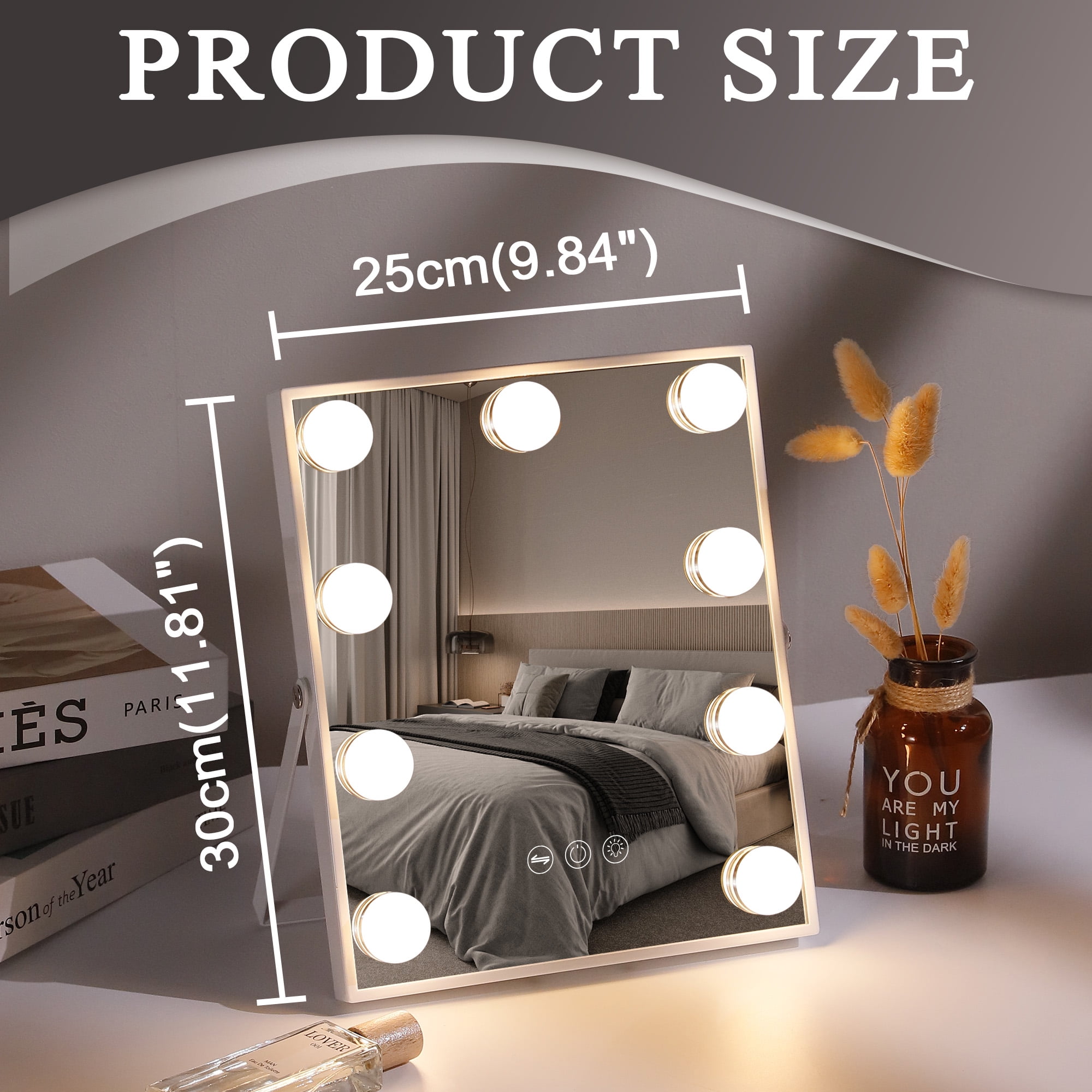 Perfect Size: 14.5 “x 18.5”, this Hollywood Vanity mirror has the best size, allowing you to see your entire face and saving space. 360° Swivel: The makeup mirror can rotate 360 °, making it more convenient to use. Adjustable Brightness & 3 Light Settings: Lighted Mirror has 3 different light settings that can be dimmed and lit. Choose mirror lighting settings based on different weather conditions and brightness to make your makeup more natural and beautiful Detachable 10X Magnifying Mirror: There is a 10X mini magnifying mirror for your makeup, so you can view the details of your makeup. After-Sale Service: We will take full responsibility for any quality damage and provide a 12-month warranty service. If you encounter any problems, please do not worry and feel free to contact us at any time.