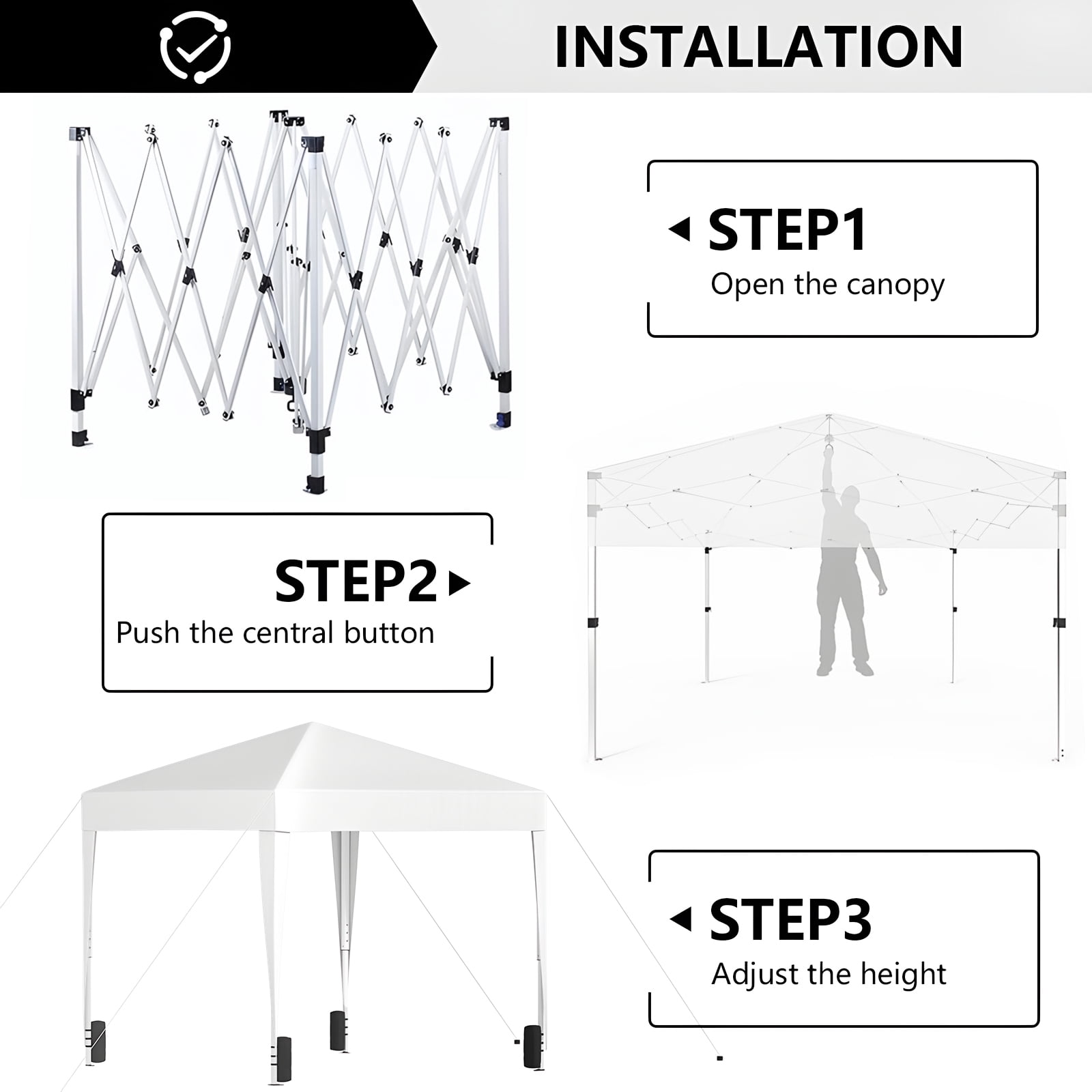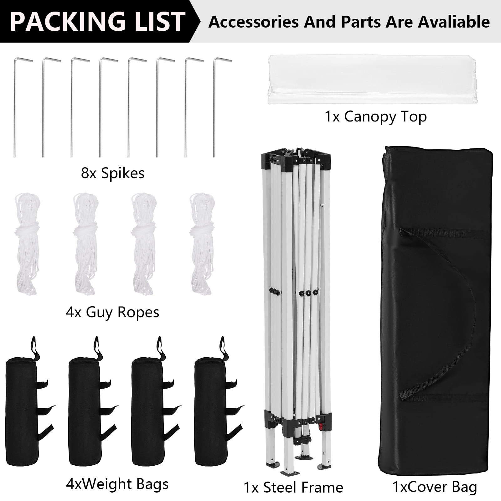 Durable Steel Frame: Reinforced truss poles and legs ensure stability. UV & Waterproof Protection: 210D Soxford fabric offers UPF 50+ and 100% waterproofing. Effortless Setup: One-piece frame with one-push center lock for easy assembly. Versatile Height Adjustment: Adjustable height settings for various occasions. Spacious 10×10 Size: Ample room for booths and multiple chairs. Portable Design: Includes wheel bag for easy transport and storage. Complete Accessories: Comes with sandbags, ropes, pegs, and instructions. Rust-Resistant Finish: Powder-coated steel for enhanced durability.