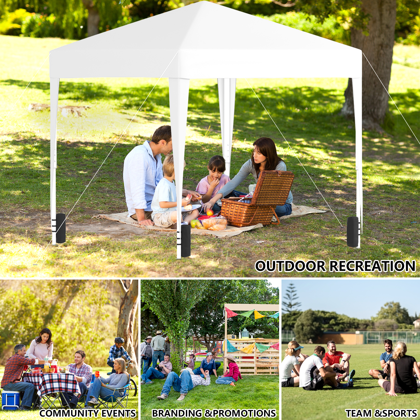 Heavy Duty Metal Structure: This canopy tent features reinforced truss poles, stress points, and sturdy steel legs with a rust-resistant powder-coated finish for enhanced durability and stability. UV-Proof & Water-Proof: The pop up canopy is made from durable 210D Soxford silver coated fabric, offering UPF 50+ UV protection and 100% waterproofing, perfect for sun and rain protection during camping, parties, and other events. Easy Up Canopy Tent: Our 10×10 pop up canopy is designed with a sturdy metal one-piece frame and one-push center lock technology, allowing for effortless setup without the need for tools. Large Capacity & Adjustable: The canopy tent 10×10 can easily accommodate booths and multiple chairs, with adjustable height settings to suit different occasions and needs. Portable Canopy Tent: This folding pop up canopy tent comes with a wheel bag for easy transport and storage, including sandbags, ropes, pegs, and assembly instructions for convenience.