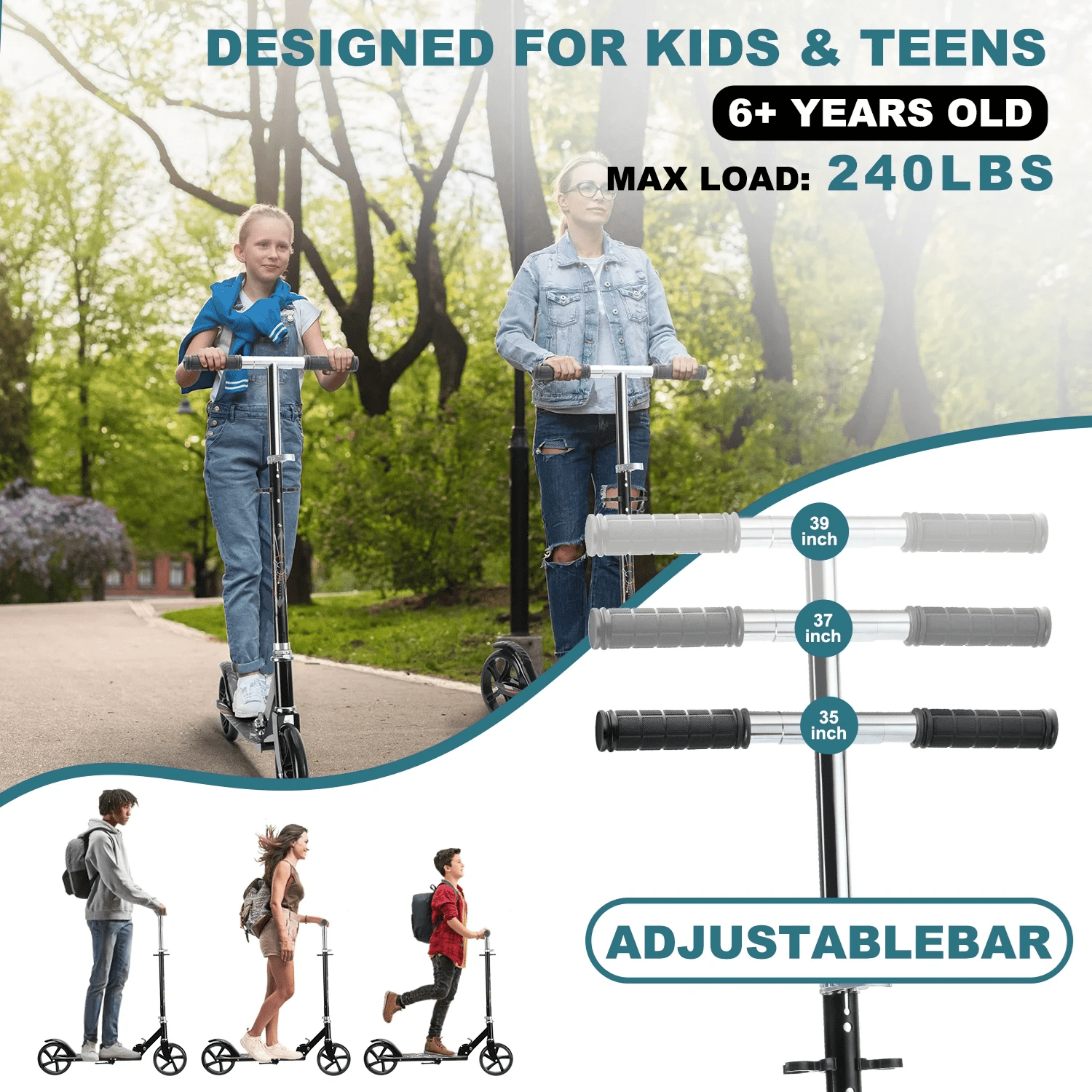 The Ideal Gift for Any Occasion. Accommodated Riders up to 200lbs. Large Comfortable Over-Sized Deck Platform for Big Feet. Extra-Large Ultra-Smooth Rolling 8″ / 200mm Composite Core Wheels. 3-Stage Height-Adjustable Handlebar with Upgraded Rubber Grips. Wide 16″ Handlebar is More Comfortable for Adults or Teens. Smaller Packaging, Some Basic Assembly Required. Special Feature: Lightweight Weight Limit: 200 Pounds Number of Wheels: 2 Material: Polyurethane; Alloy Steel Item Weight: 9.3 Pounds Handle Height: 39 Inches Age Range (Description): Teen; Kid; Adult Recommended Uses For Product: Recreational Activities, Commuting [Versatile and Convenient] The Fenbeli 200mm black scooter is the perfect choice for teens and adults, offering a comfortable and smooth ride on various surfaces. Whether you’re commuting or enjoying leisurely rides, this scooter ensures effortless gliding. [Lightweight with Durability] Our scooter strikes the ideal balance between lightweight design and durability. The rattle-free T-bar handlebar adds stability and control during rides, ensuring a safe and enjoyable experience for riders of all ages. [Easy Folding Portability] The portable scooter requires no assembly and is ready to ride straight out of the box, which means effortless transport and storage. Take it with you wherever you go! Whether it’s a quick trip to the park or a weekend adventure, our scooter is ready. [Adjustable Handlebar] The ergonomic handlebar is easy to adjust, which can adjust to 3 different heights, accommodating riders of all sizes. By adjusting heights, this scooter can grow together with your kids. You do not have to keep buying a new scooter every year! [Ride Effortlessly] Thanks to the quick stop rear fender brake, you will ride confidently knowing that you’re in control. With a durable anodized finish and unisex colors, our scooter suits anyone’s style.