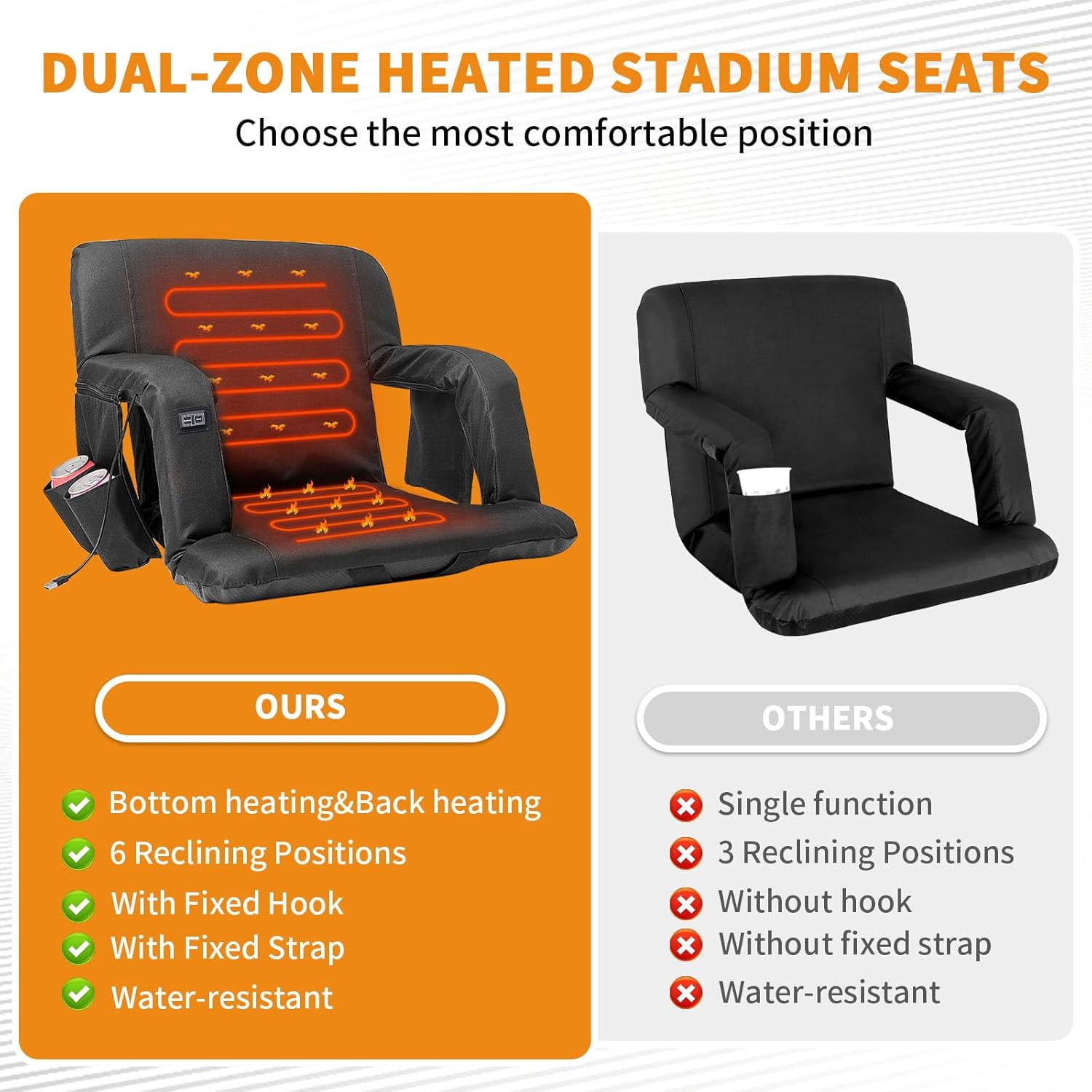 【✅ Larger Heating Area, Better Heating Effect】With a dual zone independent control heating design, the heating area is larger and the heating effect is better. Two controls respectively control the heating of the bottom and backrest. You can choose to heat the bottom or backrest according to your actual needs, or insert two wires into different power banks (power banks are not included in the package) to heat both the bottom and backrest at the same time. 【✅ Dual-Zone Independent Controlled Heating System】Our Heated Bleacher Seat upgrade with dual-zone independent controlled heating system. You can heat both the seat and backrest simultaneously, or heat the seat cushion or backrest separately. More personalized usage methods. Bringing you a convenient user experience.Two controls respectively control the heating of the bottom and backrest. You can choose to heat the bottom or backrest according to your actual needs. 【✅ 6 Reclining Positions】The heated bleacher seats can avoid the muscle soreness caused by sitting for a long time, you can focus more on your game or performance. The heated stadium chair has 6 reclining options, you can choose the most comfortable position to enjoy your happy time. 【✅ Upgrade More Stable&2 Fixed Methods】Our Stadium seats for bleachers designed with 2 hooks and one fix strap for more stable use. It can be secured easily and quickly to most bleachers and benches. Which is not easy to move and more stable.NOTE:The hooks are hidden inside the bottom zipper. 【✅Widely Used】FICISOG heated stadium seat is an excellent choice for any sport such as football, baseball, basketball, Olympics, World Cup, as well as outdoor activities, adventures, beaches, parks, camping, and travel. Stadium seats for bleachers are perfect for those who spend long periods of time with their children during training or waiting on the sidelines of sports events. Say goodbye to hard, chilly bleacher!