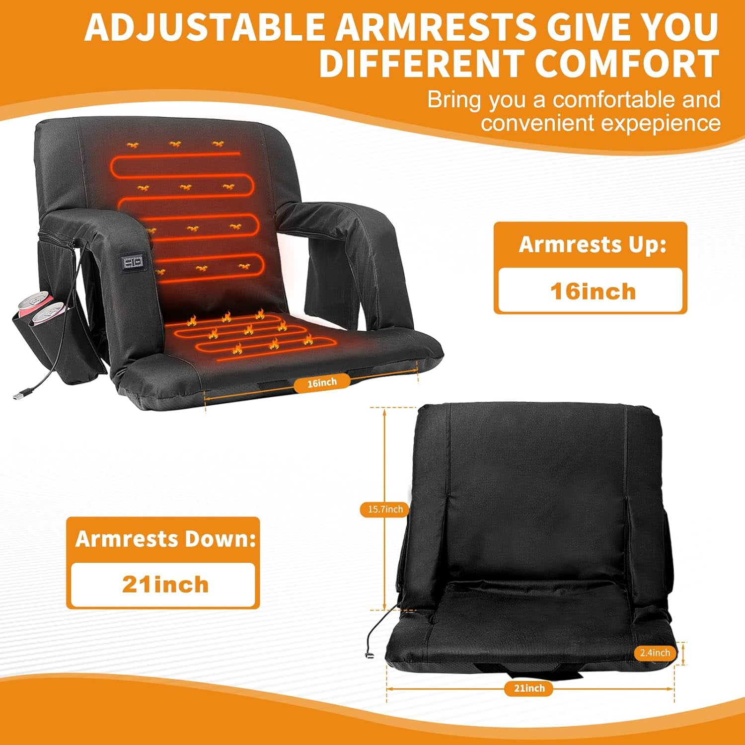 FICISOG portable heated stadium seat with heated back and bottom can provide the ultimate warmth and comfort for your body in cold weather. The heated stadium chair has 6 reclining options, so you can choose the most comfortable position to enjoy your happy time. Armrests can be adjusted to increase the width of the seat. The heated stadium seat for bleachers has 2 side pockets and 2 cup holders that you can conveniently store your personal items. Stadium seats are designed with shoulder straps. With the shoulder straps, you can easily carry it to stadiums, camping, parks, beaches and anywhere you want to go. There are two bleacher straps on the bottom of the seat to secure the seat well. The heated stadium chair is easy to carry and store. Great for sporting events, outings, camping, travel, garden parties, hiking, picnics, barbecues, backyards, beaches, fishing, and more.