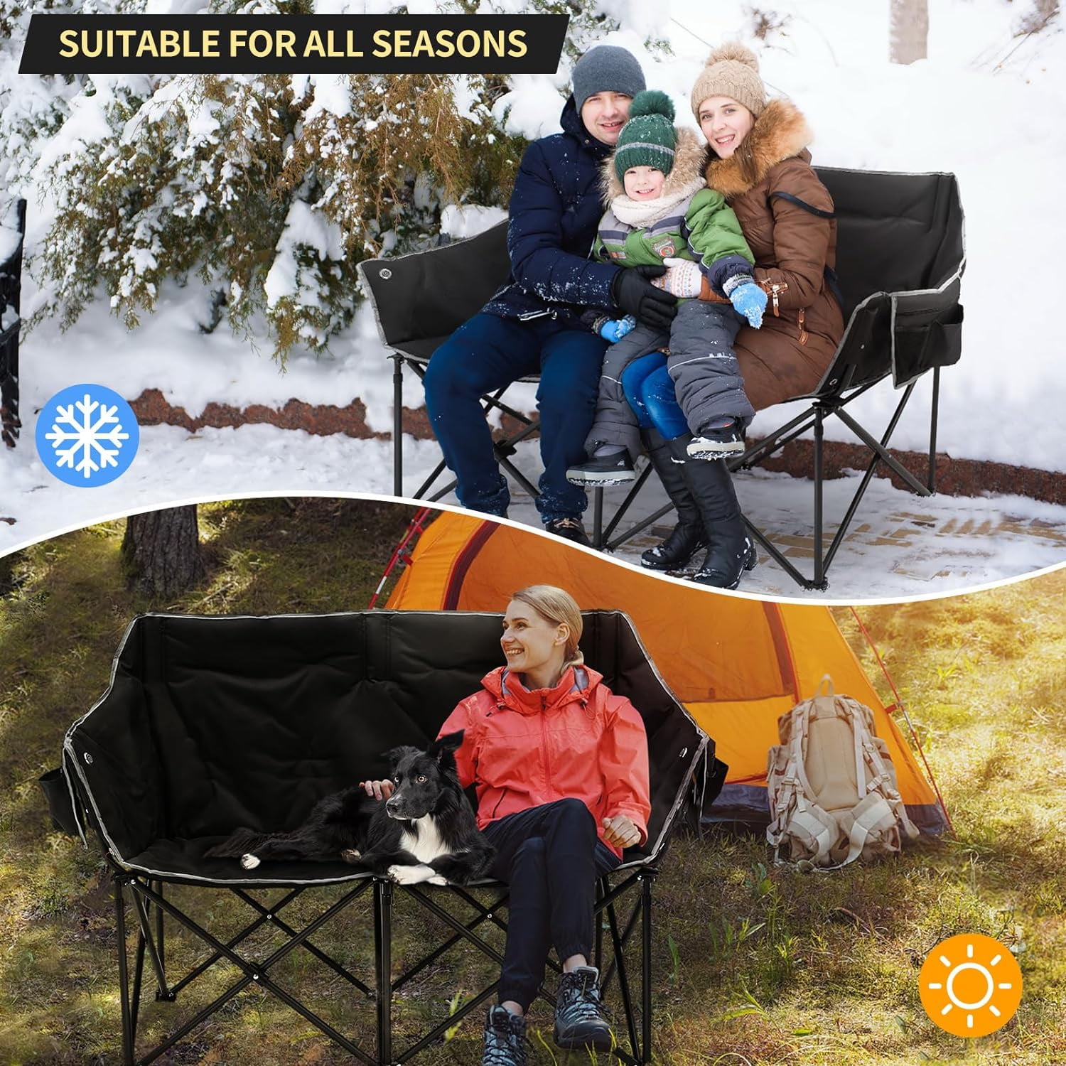 FICISOG Oversized Heated Camping Chair, Two Person Folding Loveseat Double Camping Chair, Heavy Duty Heated Folding Chairs Moon Chair Lawn Chairs for Camping