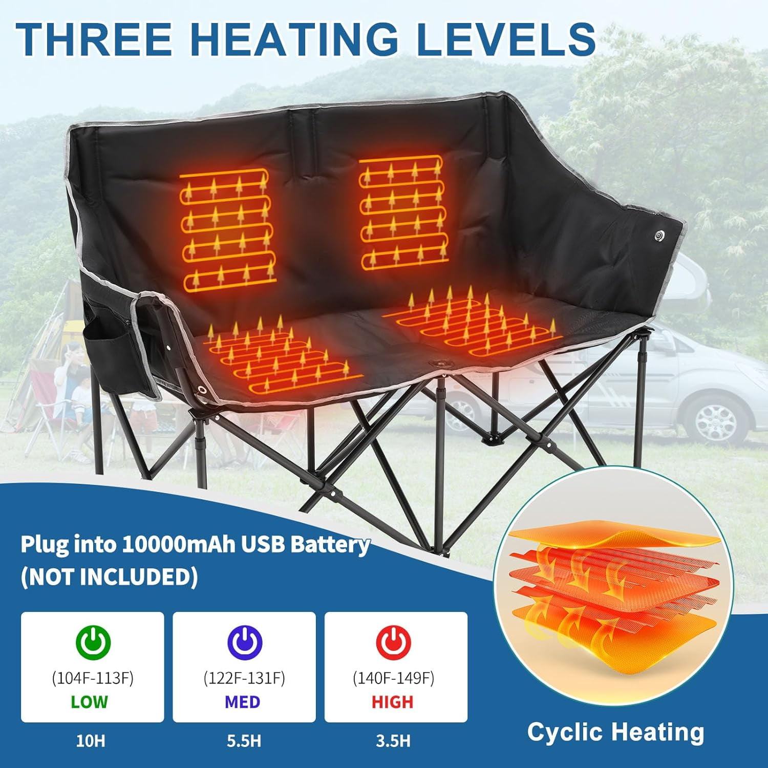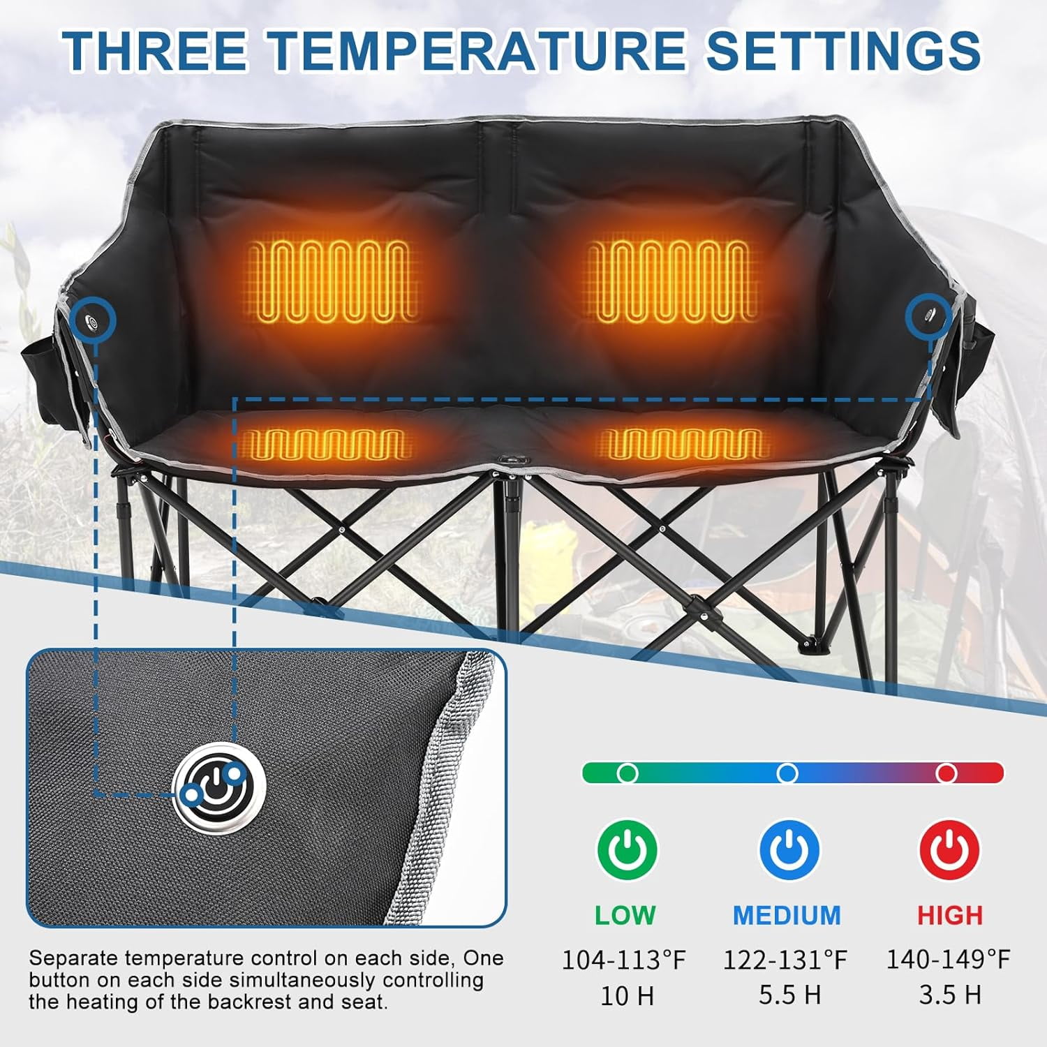 FICISOG heated double outdoor chair features 4 heating zones and 3 adjustable heating levels with USB-powered heating technology (Output: 5V/2A, battery Not included). Long Press The Button to Control on/off, and short press the button can easily adjust 3 heating levels for back and seat (122°F/ 113°F/ 104°F). Keeping you warm and safe for cold baseball football games, or other outdoor activities. Durable oxford fabric make the chair extra sturdy. Stable steel frame construction make it can support up to 550 lbs. Enough load-bearing capacity for two adults to sit down at the same time, and enjoy the warmth together brought by this heated outdoor chair. You can easily fold and open it in a minute. We will provide a closing strap and a beautifully carry bag with carrying strap, you can put it on the car or carrying it on your shoulder to outside, this heated portable chairs for adults will provide you with a relaxing and pleasant outdoor experience.