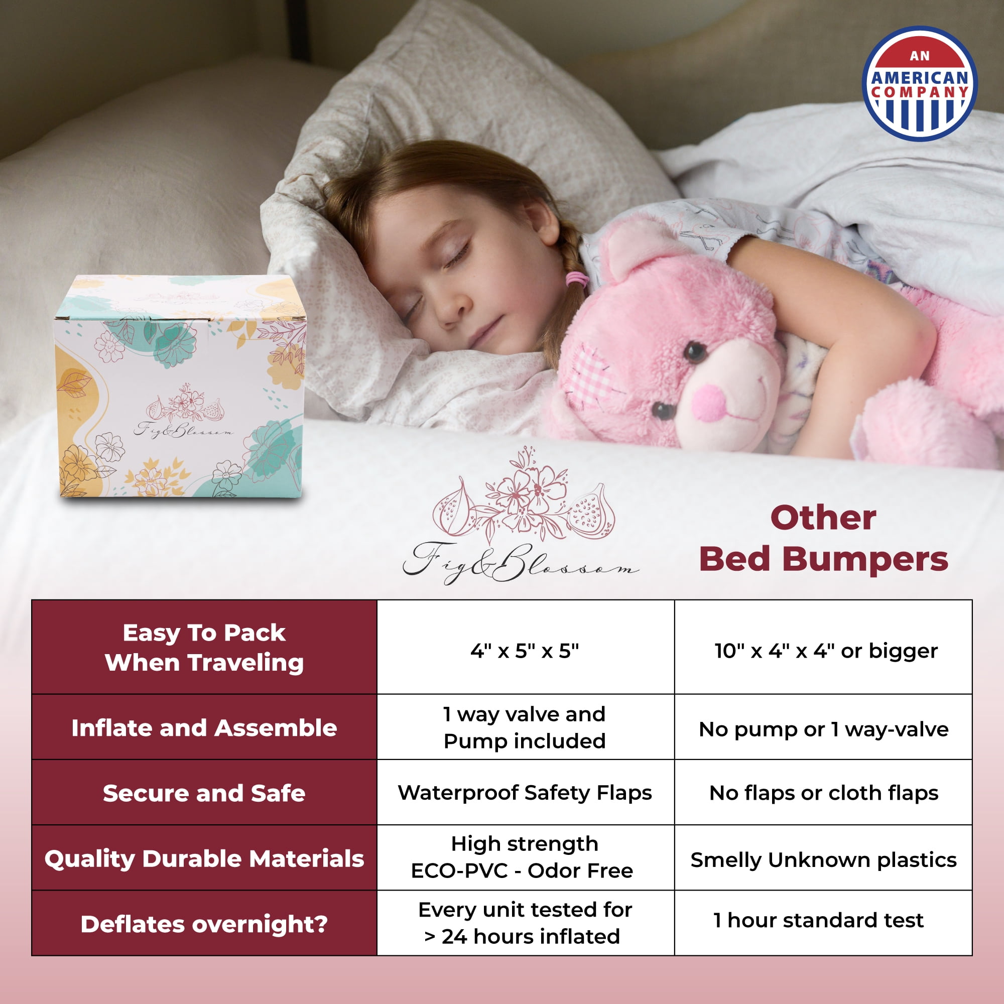 Fig and Blossom Inflatable Bed Bumper with Safety Flap Super easy to clean – Our one-of-a-kind waterproof toddler bed bumper design requires no grip strips or washable covers. No need to wait to wash, if a mess occurs during the night or anytime, simply wipe clean and have your little one back to bed in minutes, not hours. NO MORE FALLING OUT OF THE BED ON THE GO OR AT HOME – Our compact portable bed bumpers for toddlers are perfect for travel, sleep overs, Grandma’s house, or home use– they blow up fast and easy with the 1-way valve and our included air pump, or just a few breaths of air. Designed for use in TODDLER, TWIN, FULL, QUEEN, and even KING size beds. INDEPENDENT LAB SAFETY CERTIFIED – We don’t sell anything we wouldn’t trust with our own four kids. That is why our portable bed rails for toddlers have met all required ASTM, CSPA, CFR, CPSIA, and CPSC standards as verified by an accredited facility. NO LEAKS – SUPER DURABLE – Strong and ultra-soft ECO-PVC with reinforced seams provide all night safety and comfort with no noise, no matter how much your little one rolls around. Our safety flaps keep bed bumpers in place all night long ensuring a safe night of sleep. We have rigorously tested our toddler bed rails to ensure they hold air for weeks and beyond. U.S.A. SUPPORT TEAM GUARANTEES TOTAL SATISFACTION – Our Nashville-TN based team at Fig & Blossom is dedicated to meeting and exceeding your standards. If you are not happy with any part of your product for any reason, please reach out to us so we can make it right, or just to say hi and let us know you love it 🙂