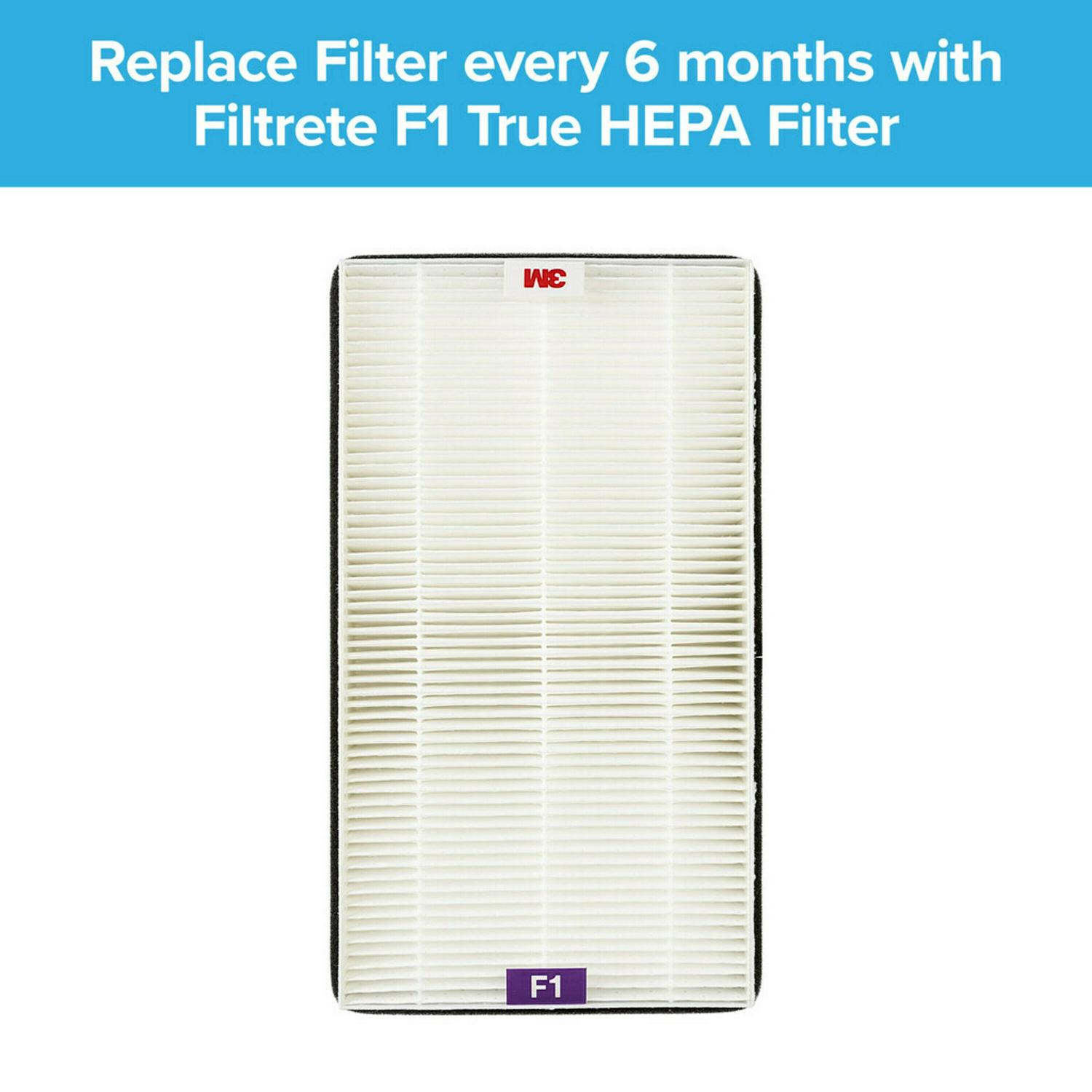 Not sure which Filtrete device or filter to buy CLICK HERE to view our help guide.Click below to view F1 replacement filters for this device:1. Filtrete by 3M Advanced Allergen, Bacteria, and Virus True HEPA air Purifier Filter – F1 Size2. Filtrete by 3M Allergen Reduction + Odor Reduction HEPA-Type Air Purifier Filter – F1 Size3. Filtrete by 3M Allergen Reduction HEPA-Type Air Purifier Filter – F1 SizeHelp improve your indoor air quality with the Filtrete Room Air Purifier. Great for large rooms, this stand alone unit comes with the Filtrete Advanced Allergen, Bacteria & Virus True HEPA Filter for our best capturing power. The True HEPA Filter captures 99.97% of airborne particles from the air passing through the filter media*. (*Disclaimer: as small as 0.3 microns, from the air passing through the filter media. Initial efficiency value.)