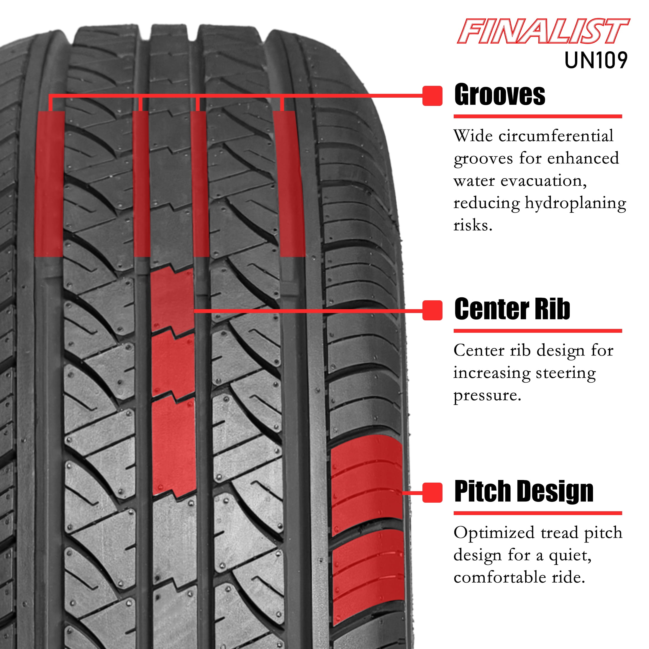 Finalist UN109 All Season 205/55R16 91V Passenger 205/55/16 (Tire Only) Features And Benefits Road Hazard Warranty Manufacturer Tread Wear Out Warranty All season traction Low on-road road noise Durable controllability Self-cleaning tread design OVERVIEW The Finalist UN109 is an all-season high-performance tire designed for a more comfortable ride with reduced noise. The 4 circumferential grooves provide outstanding water evacuation, resisting hydroplaning and thus improving vehicle control and driver’s safety. Addition, our tire product comes with a Road Hazard Warranty, and here’s how it benefits you: This warranty provides you with protection against unforeseen road circumstances such as punctures, cuts, or other damages. If your tire gets damaged due to road conditions while driving, our warranty offers support and assistance without any additional expenses on your part.Purchasing our tire product grants you this reassuring Road Hazard Warranty, adding an extra layer of safety to your driving experience!