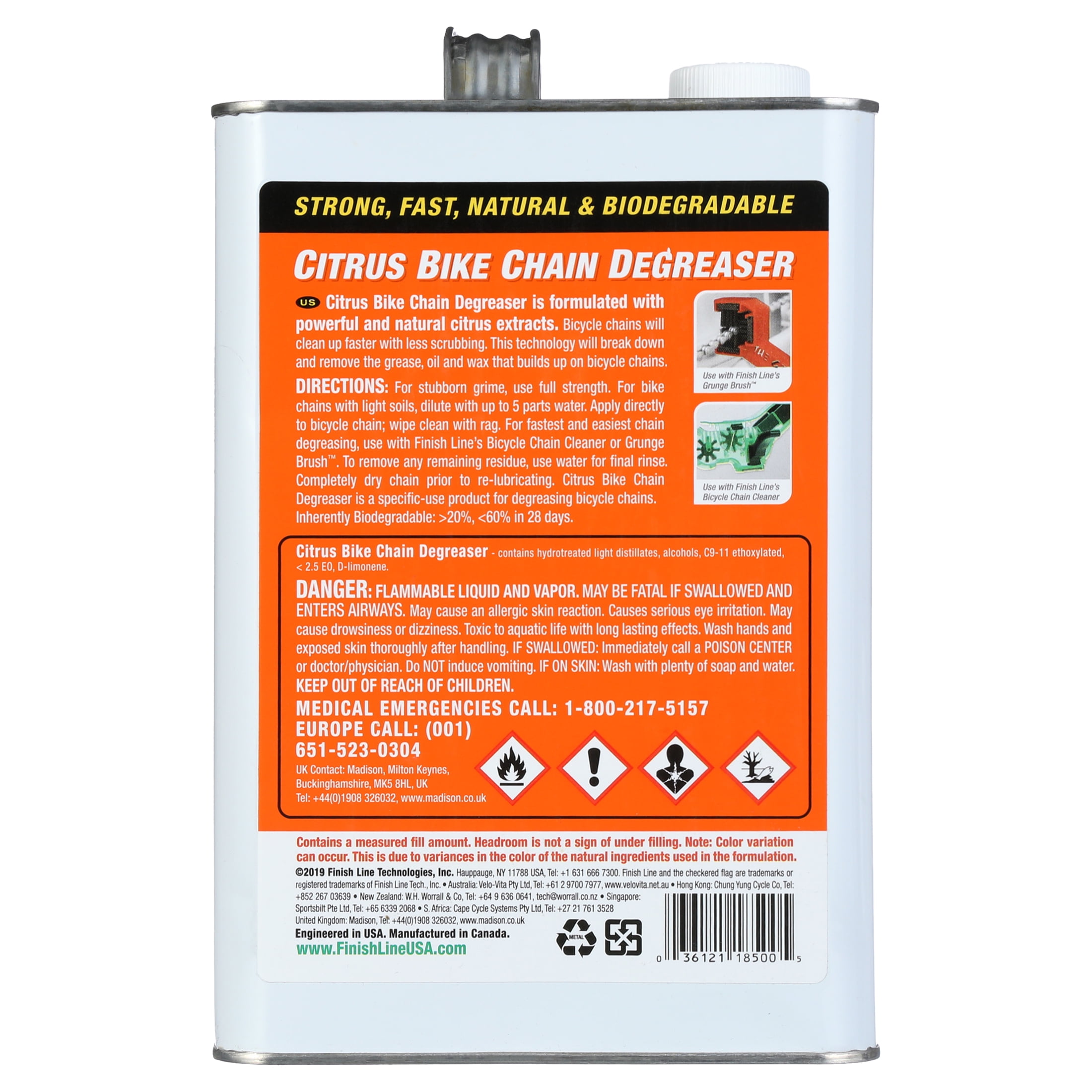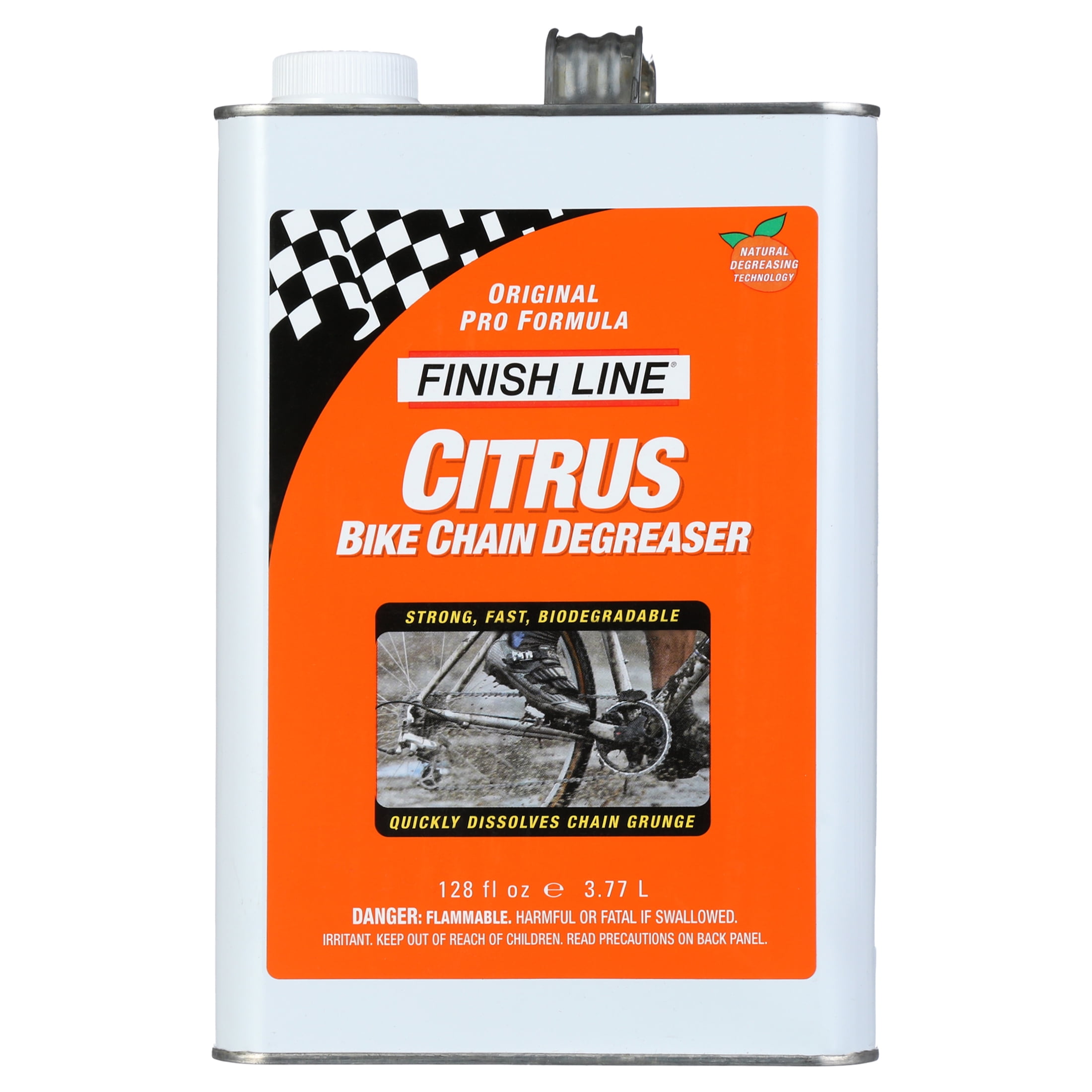 Finish Line Citrus Degreaser. Super strong and fast. The industry original orange peel based cleaner that has set the standard since 1988. Cuts through the toughest of carbonized grit, grease, and grime. Low surface tension for thorough penetration into all areas. Parts clean up fast and then rinse residue-free with water. 100% active, contains no water. Biodegradable and nontoxic .Citrus Degreaser is non-toxic when used in quantities and applications as intended and contains no carcinogenic or hazardous air polluting (HAP) ingredients.