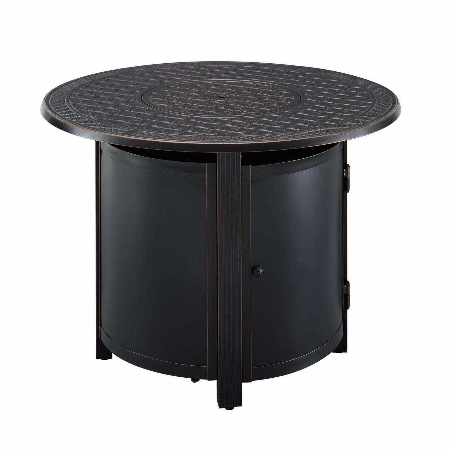 The Fire Sense Woodberry Round Aluminum Propane Fire Pit shows off a geometric diamond pattern and burnished antique bronze finish, compatible with classic and contemporary outdoor décor. With a practical aluminum build and an adjustable full-flame output of 37,000 BTU, this versatile and compact fire pit pulls double duty as a patio table when covered with the included fire bowl lid. Arriving with clear fire glass for a sparkling accent, just add a standard 20 lb propane tank behind the handy hinged door. A weather-resistant cover for the fire pit is included for your convenience.