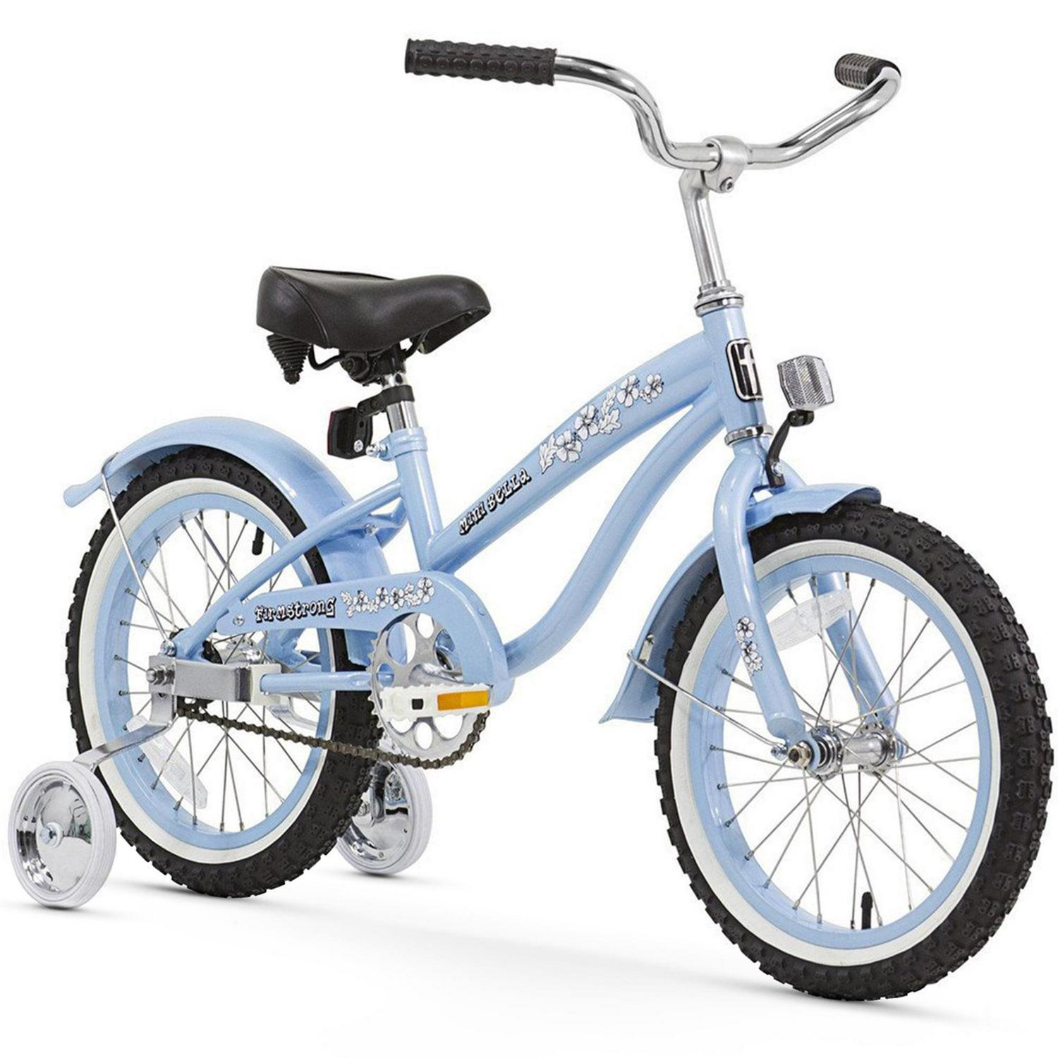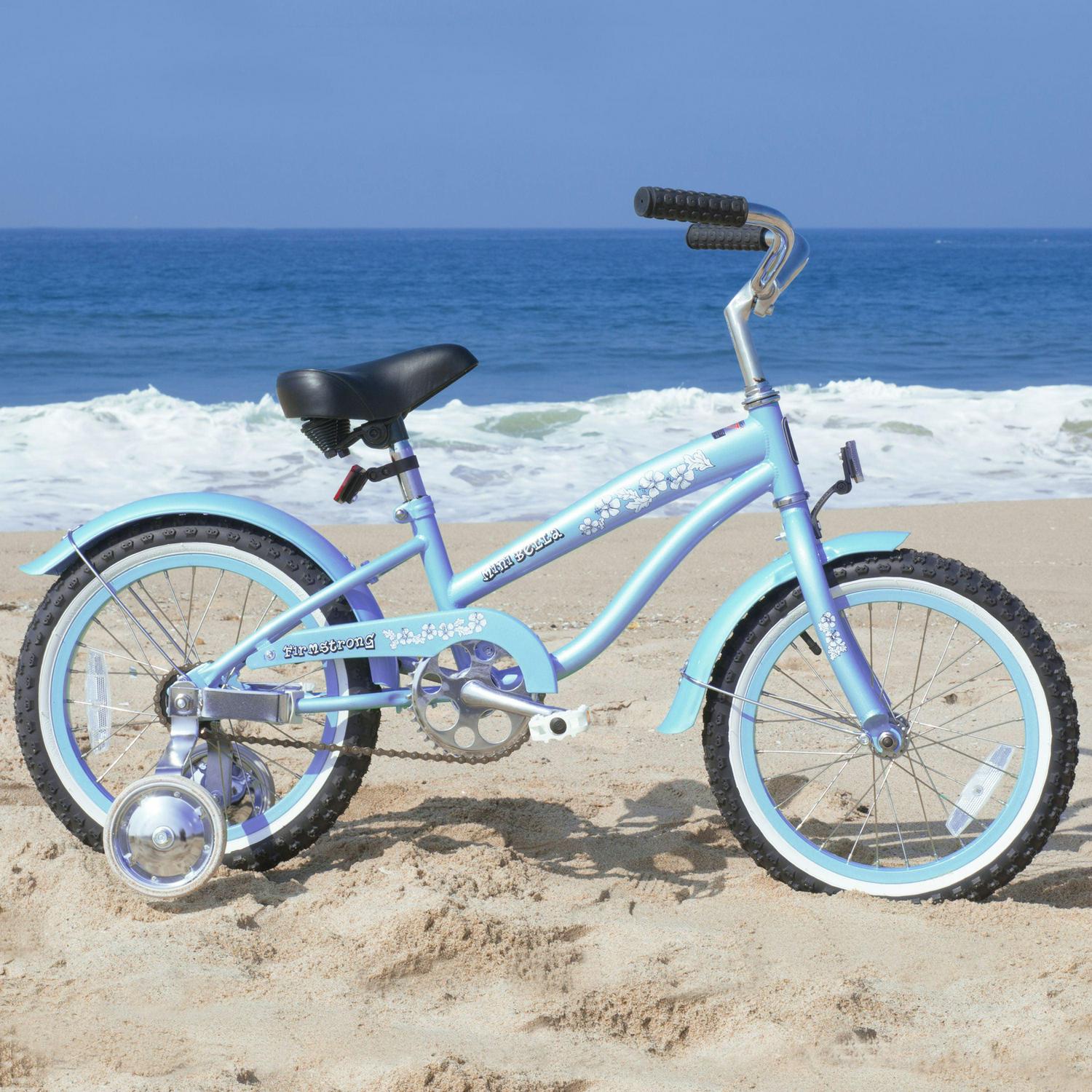 The Firmstrong Bella Girl s Bicycle with Training Wheels features a classic beach cruiser design that is ideal for young riders riding along the neighborhood or along the boardwalk. The 9-inch durable steel frame and wheels shine against the whitewall tires with tread tires for solid gripping. Available in a single speed with supportive training wheels, your child will be ensured a smooth and safe ride as the coaster brakes can be used for easy stopping by simply pedaling backwards. When you re not cruising around on the wide, oversized seat, you can rest your hands on the handlebars complete with stylish synthetic leather grips. Featuring beautiful floral accents, with the Firmstrong Bella Girl s Bicycle with Training Wheels, your child always enjoy their ride about town!
