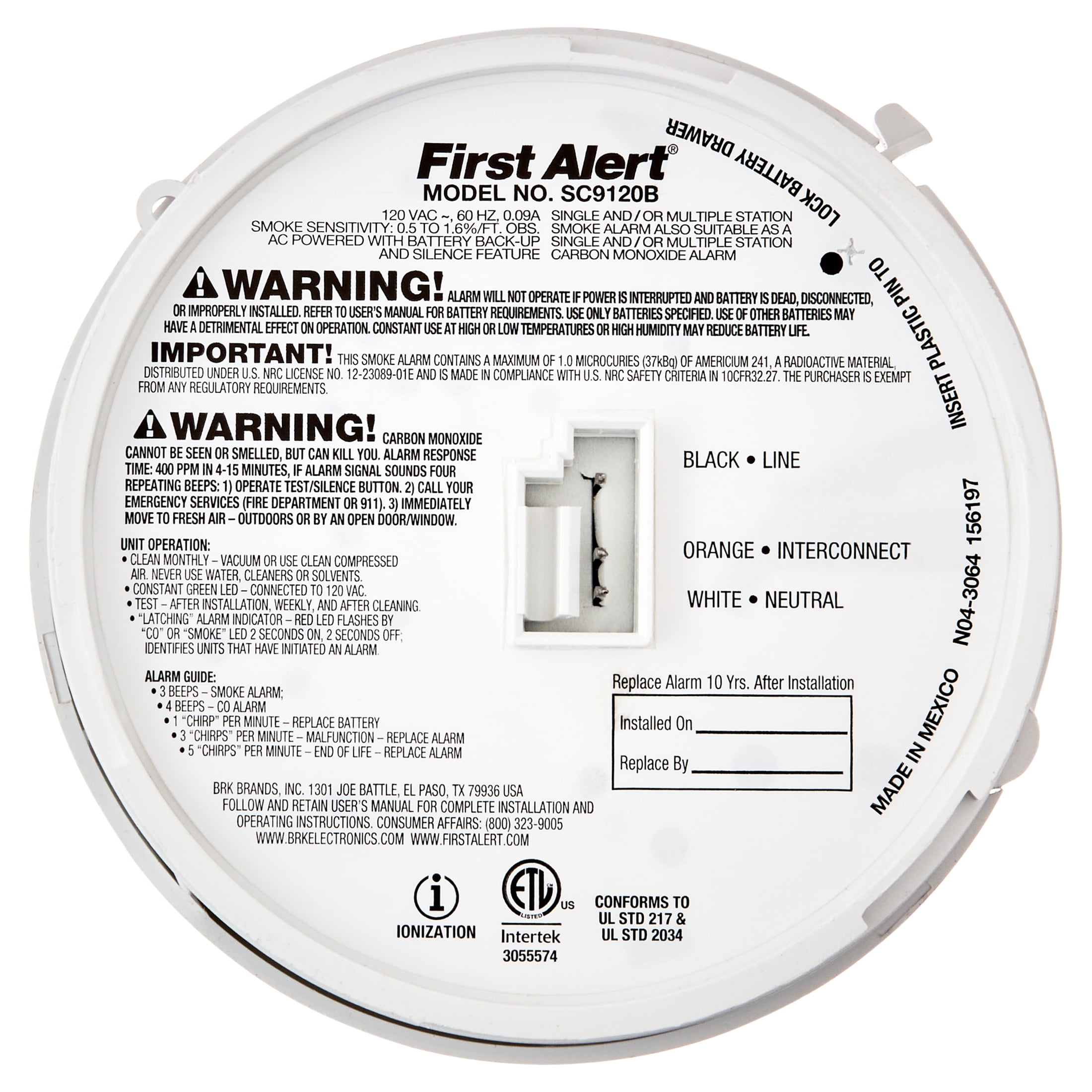 First Alert BRK SC9120B 85-Decibel Ionization Hardwired Smoke and Electrochemical Carbon Monoxide Detector with Battery Backup