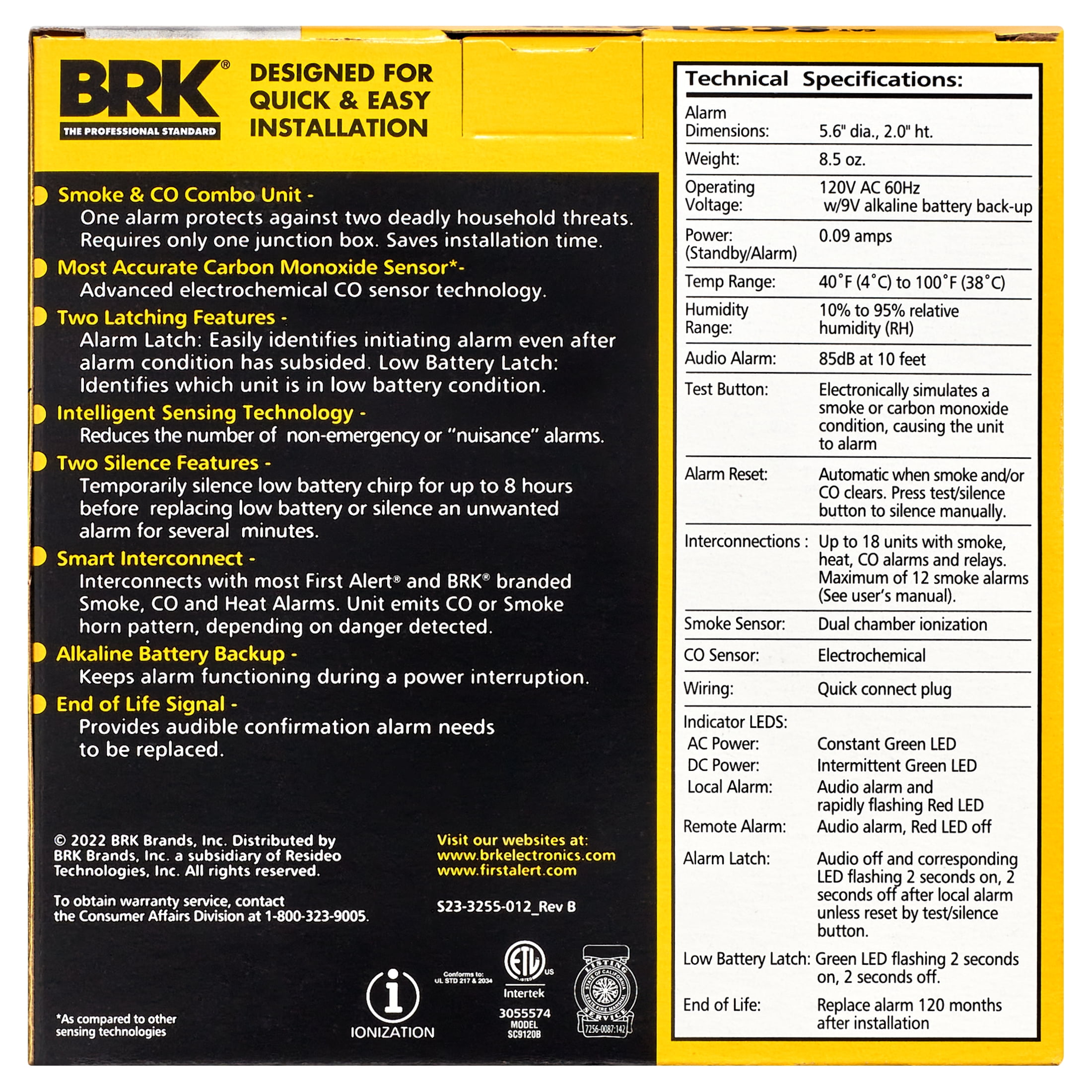Features an electrochemical Carbon Monoxide sensing technology as well as an ionization sensor that detects the fine particles of a fast-burning fire Indicator lights on the face of the unit display the presence of smoke or carbon monoxide, while an 85-decibel siren provides a clear, loud warning upon detection Simple to use, with a single test/silence button, and side-load battery compartment; tamper-resistant locking brackets and universal mounting brackets make installation easy Rigorously tested to meet UL standards