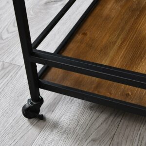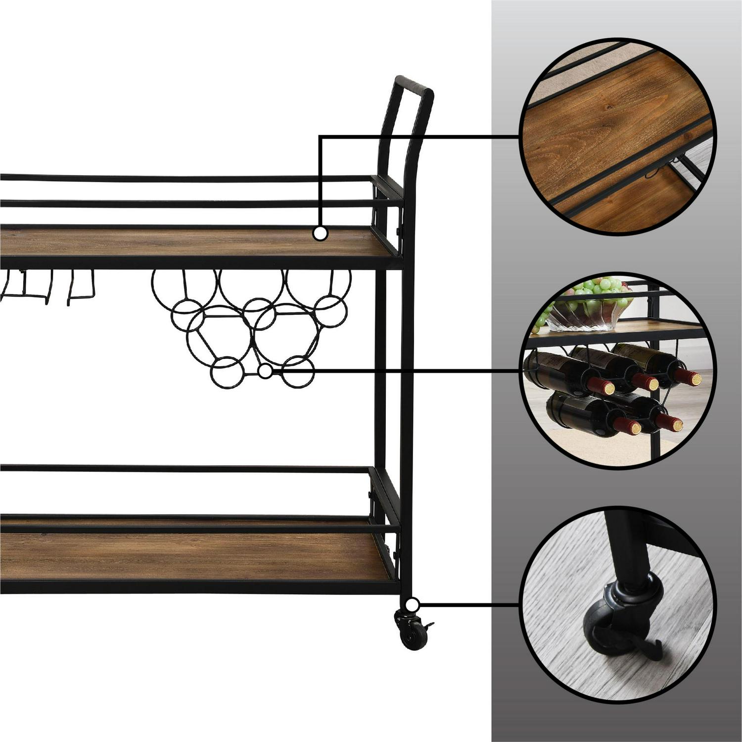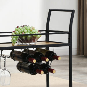 – IT S IN THE DETAILS This rustic brown bar cart is a versatile piece with a metal frame and wood shelves, with racks on the second tier that can hold up to 6 wine glasses and 5 compartments for wine bottle storage. The top is open to allow you to set drinks and snacks on top, and it comes with 4 metal wheels for easy maneuvering.