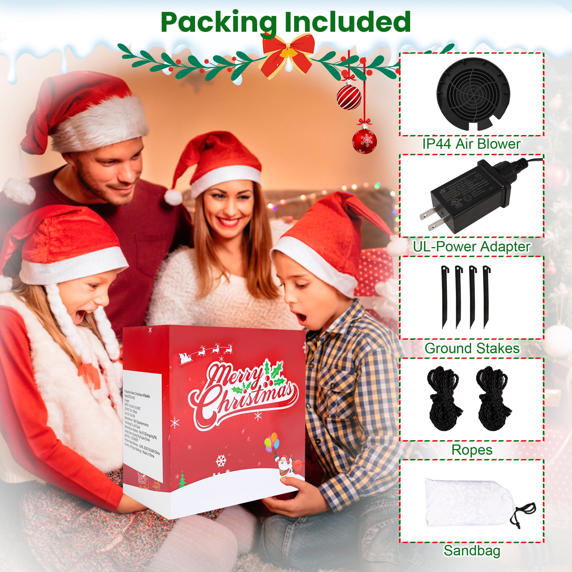 Unique Christmas Decoration: Unique and cute eye-catching design and perfect size, loved by children. Perfect for your patio, garden, party and indoor. LED Lights: With bright and energy-saving LED lights, create a brilliant light effect to attract the attention of neighbors and friends. The long power cord makes it easy to use this inflatable decoration outdoors. Waterproof Fabric: Made from waterproof 210T polyester fabric, this one is durable enough for indoor and outdoor use. In addition, built-in sandbags (load sand yourself), ropes, and wooden stakes for stability, and can withstand all kinds of wind and snow weather. Quick Inflation: Built-in high-speed fan, it can be easily inflated. You just plug it in and it quickly inflates to become an eye-catching addition indoors or out. Easy to Store: Designed with a bottom zipper, this Christmas decoration deflates easily so you can easily store it to save space in your home when the holidays are over. Note: 1. Tighten the bottom zipper when inflating to prevent air leakage. 2. Avoid putting other objects into the blower or decorations, otherwise damage may occur. 3. When deflating, open the zipper to deflate quickly and easily.