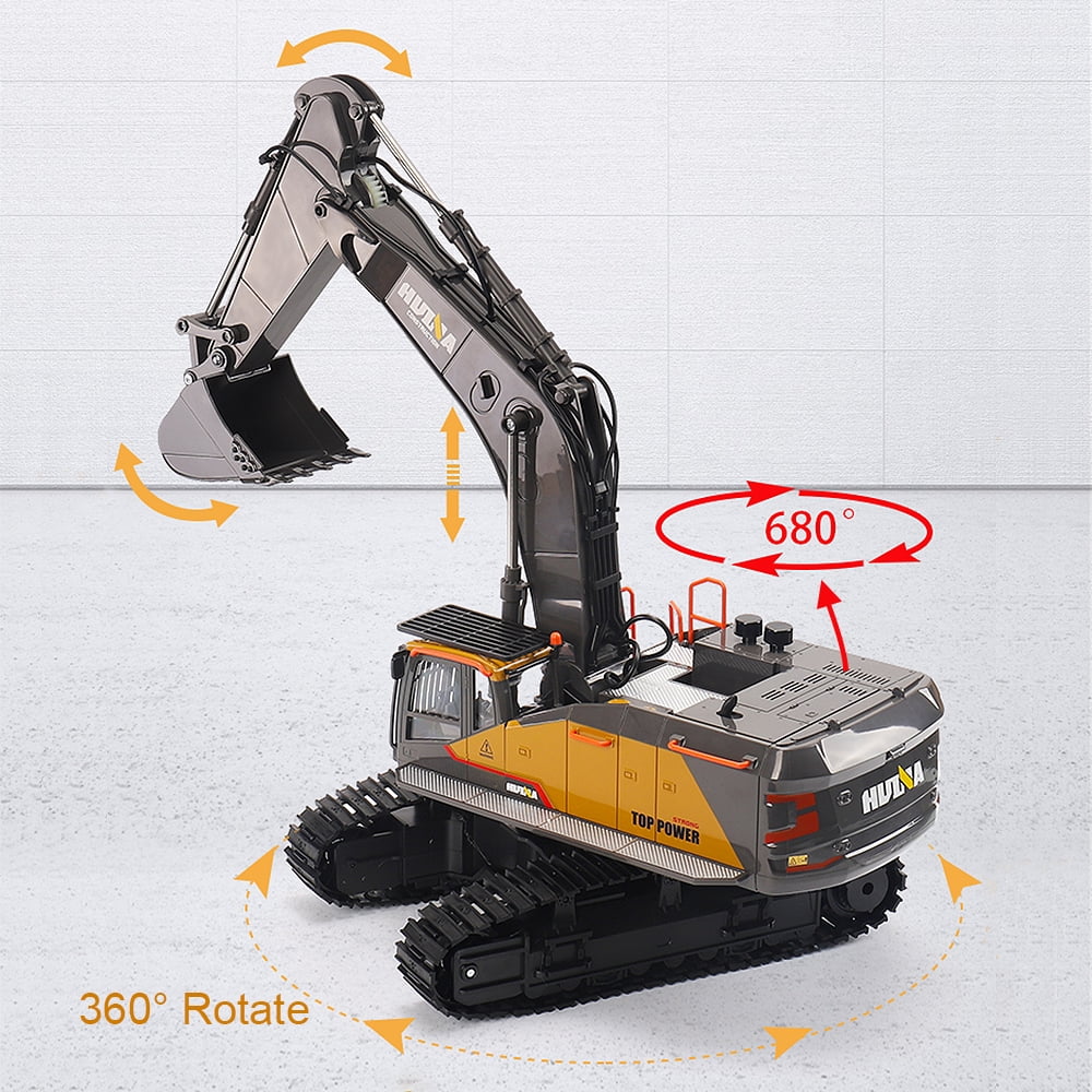 Fisca 1/14 Remote Control Metal Bucket Excavator Toys is a total recreation of real construction vehicle, which is simillar in not only appearance but also multiple functions and even light and sound. Durable metal bucket and powerful motor make it possible to dig soft loose soil, sand or small stones. Besides, this remote construction truck could lift up the whole body just using bucket. To offer kids vivid construction activities and bring fantastic game experience, the excavator toy could make simulated sound and lights while digging. This rc excavator toy is able to go forward and backward, turn left and right, rorate up to 680 degrees on platform. Further more, the boom, stick (arm) and bucket could be controlled seperately to give realistic operating feeling. High quality pastic body and thickened tracks will make the toy impact-resistant and durable for various terrains. It will provide extra fun especially matching a Fisca dump. Just a marvelous construction toy gift for kids and adults.