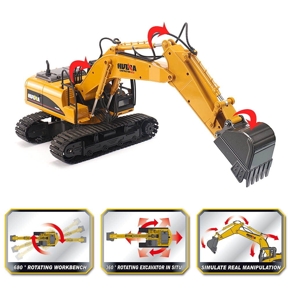 Fisca 1/14 Remote Control Excavator Toys is a recreation of real digging excavator. High detailed yellow appearance in large 1/14 size makes it a great kids contruction toys. Designed as a realistic remote control construction trucks, it has 15 channel full functions for kids and adults to explore. Digging with simulated sound and lights would offer kids fantastic game experience from vivid digger construction activities. 680° rotate platform, 110° swing up and down bucket, 100° swing up and down boom, 70° bend stick (arm) could be controlled seperately. More exciting thing is that you can hold up the whole rc digger just using the bucket. Unique 2.4Ghz frequency could support multiple construction toys without signal interference and thickened tracks is durable enough for conquering different terrains.