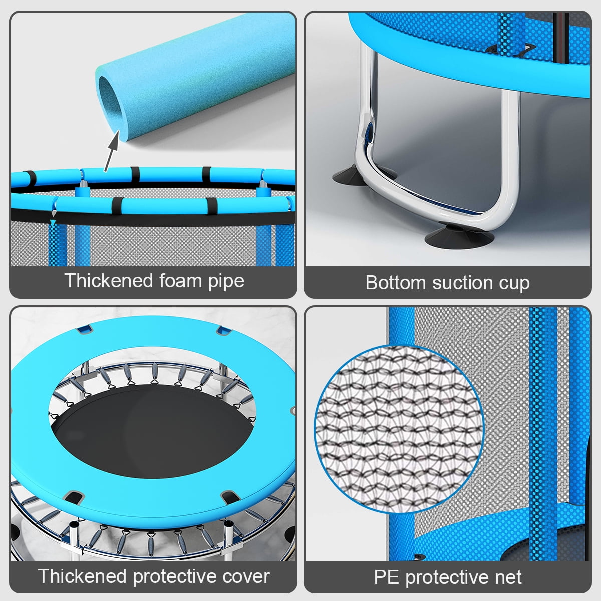 Fisca 55” Kids Basketball Trampolines is a creative indoor and outdoor backyard trampoline for kids ages 2 years and up. In this latest version of 2 in 1 horizontal bar trampoline, more marvelous accessories are attached. Detachable horizontal bar and a pair of gymnastics exercise rings that bear 500lbs weight would add more fun and choices for game and fitness exercises. One basketball hoop and 2 small basketballs are included for kids playing exciting new basketball game. The kids trampoline indoor safety enclosure net is able to support 5 to 7 kids of total weight under 555lbs playing at the same time. 2 levels of adjustable heights in 1.5m and 1.6m provide more freedom to design your own game fairyland. In addition to adopting durable enough materials like galvanized stainless steel framework and high strength net, another safety protection is also equipped fulfilled by 6 anti-slip vacuum chucks to fix the trampoline and avoid unexpectedly moving or friction noise.