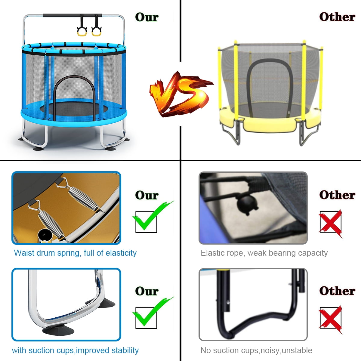 Fisca 4.6FT Toddler Trampolines for Kids with Horizontal Bar and Gymnastics Rings, Anti-Slip 555lbs Capacity Toddler Enclosure Trampolines: 2 in 1 trampoline with height adjustable handle bar and a pair of gymnastics rings for game and fitness exercises Attached basketball hoop and 2 small basketballs for interesting tossing ball games Safety high strength enclosure net and galvanized stainless steel framework, durable enough for long service life 6 anti-slip vacuum chucks for fixing the trampoline and prevent unexpectedly moving and friction noise Toddler trampoline with net is suitable for indoor room and outdoor backyard places to use Kids wonderful playing center and happy game source Diameter of trampoline: 55” (1.4m) Height of trampoline: adjustable 1.5m or 1.6m Maximum loading weight of trampoline: 555lbs for 5-7 kids Maximum loading weight of horizontal bar and gymnastics rings: 500lbs Ground clearance: 26cm Assembly is required Read the manual before use If not in use, please store it properly For Kids ages 2 years and up