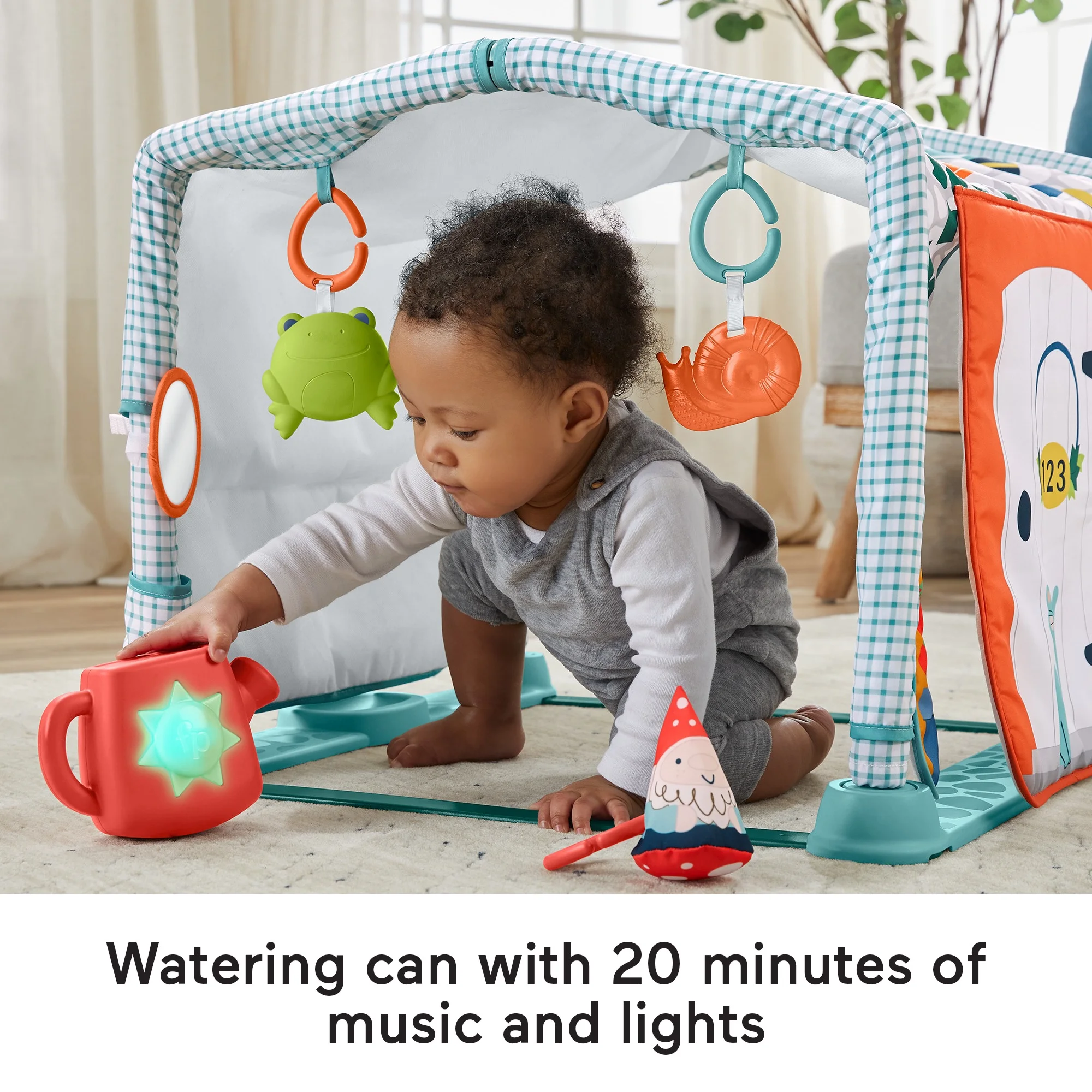 Convertible activity gym with 3 ways to play as your baby grows from newborn to toddler: lay & play mat, tummy time, and crawl-through cottage tunnel 5 repositionable toys including self-discovery mirror, frog rattle, BPA-free snail teether, crinkle garden gnome, and roly-poly “watering” can for bat-at play Electronic toy “watering” can with 2 settings, short & long, with up to 20 minutes of sing-along songs, sounds, and multi-colored lights Machine-washable playmat offers plenty of space for newborn to toddler play Helps develop sensory skills, fine and gross motor skills for infants from birth and up
