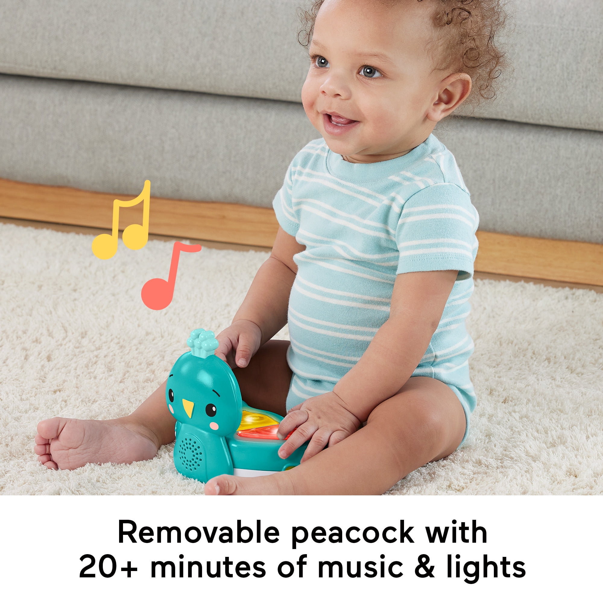 Infant jumper and activity center that rewards your baby’s every jump with fun music, lights, and sounds Seat spins for 360 degrees of play with activities all around: bat-at sloth, butterfly wheel, flamingo rattle ball roller, BPA-free leaf teether, teeter-totter alligator, flower mirror & more Removable peacock toy for travel play features 20+ minutes of music and lights, plus volume control, for engaging sensory play from newborn to toddler Easily adjusts to 3 different heights as your baby grows, plus a machine-washable seat pad for easy cleanup Helps strengthen gross motor skills and engages developing senses of sight, hearing and touch