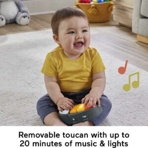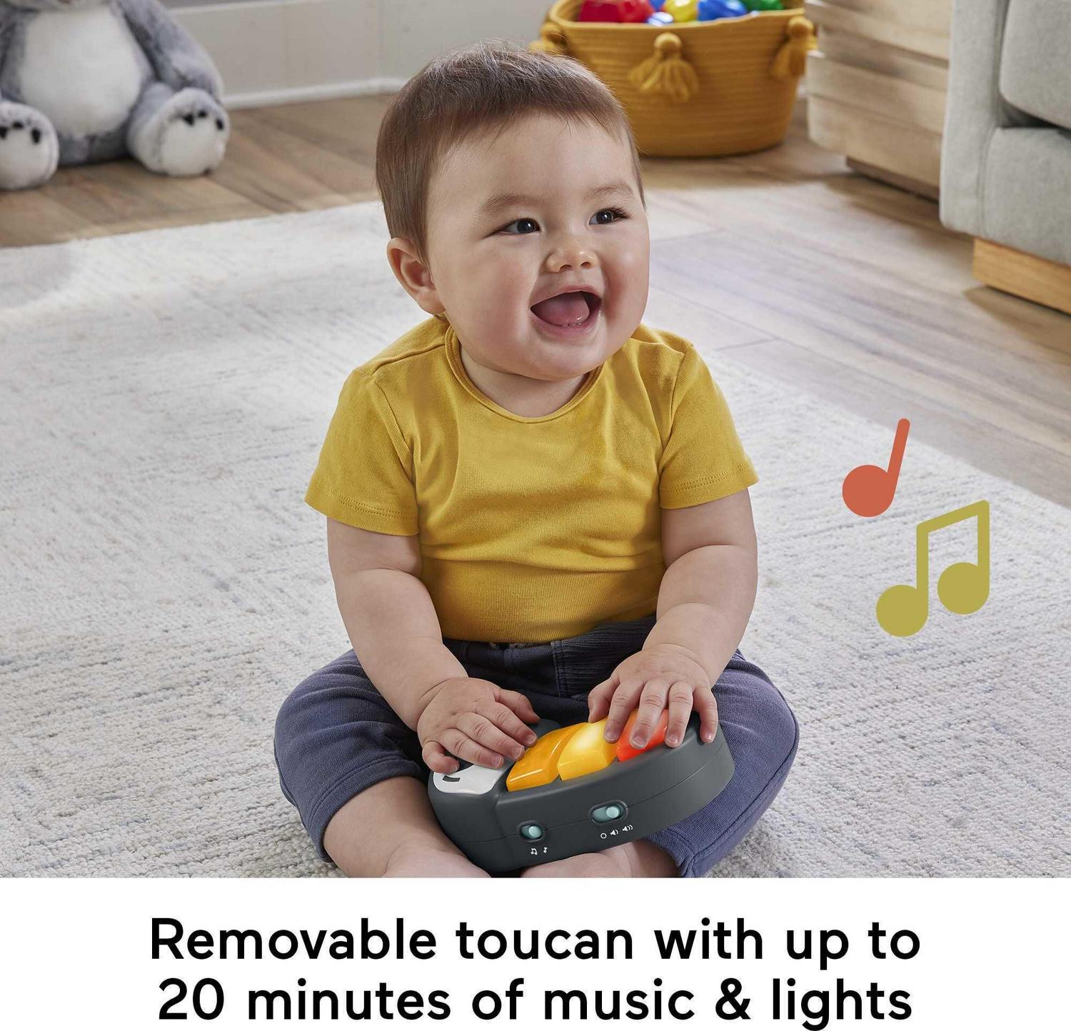 - Toucan removes for take-along play and has up to 20 minutes of music and lights