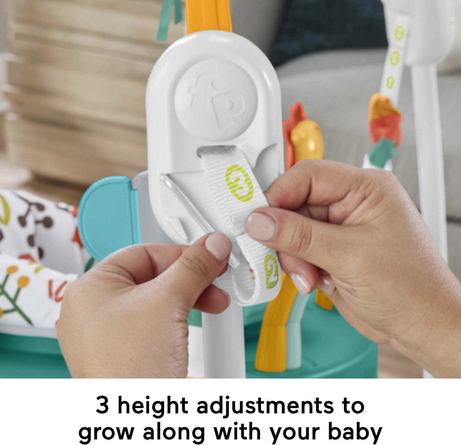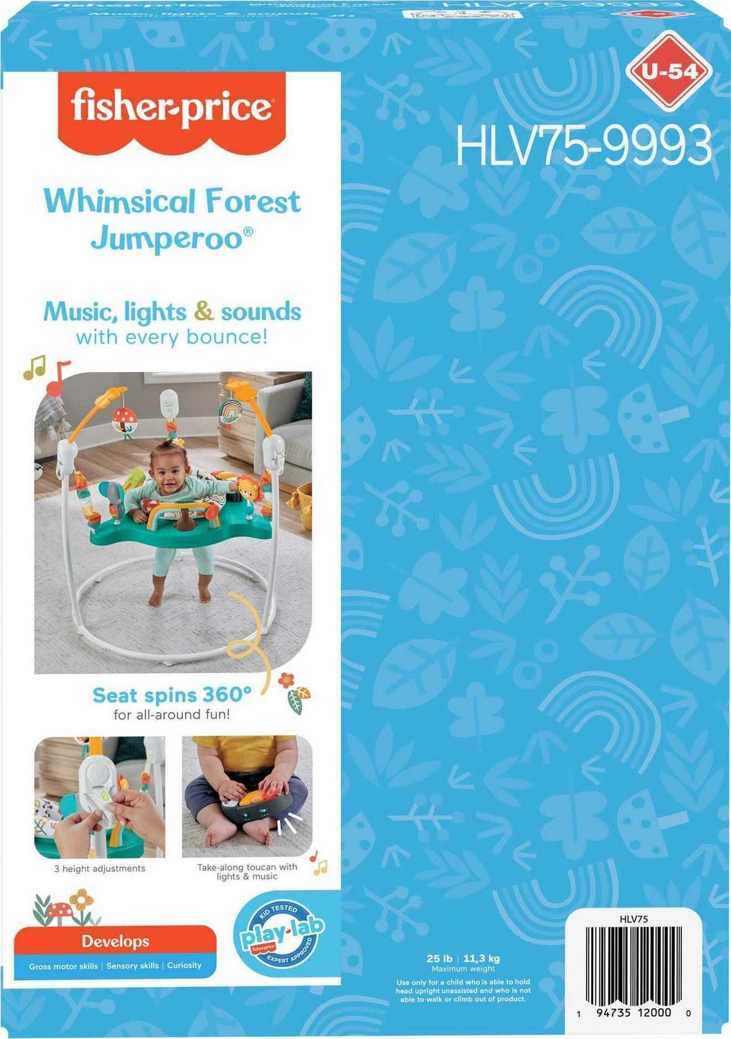 With the Fisher-Price Whimsical Forest Jumperoo activity center, your baby can bounce into enchanting sensory adventures! Every jump activates fun lights, music and sounds, encouraging your little one to keep bouncing and strengthening those gross motor skills. The freestanding jumper has a spinning seat and a variety of hands-on activities all around for your baby to explore, plus three height adjustments to grow along with your baby. Max. weight 25 lb/ 11,3 kg. Use only for a child who is able to hold head upright unassisted and who is not able to walk or climb out of product.