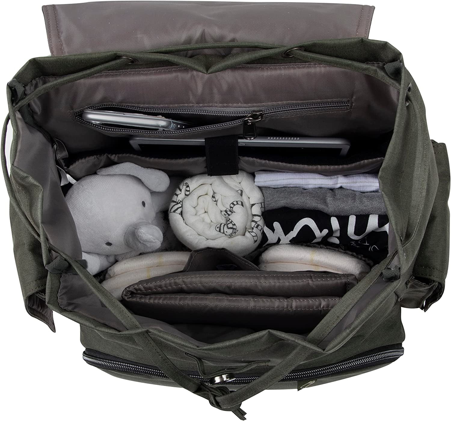 10 POCKETS TOTAL: Including (1) front zippered pocket containing (3) insulated multi-feeding bottle pocket straps, (1) padded, electronic device pocket for storing tablets and laptops, (1) external baby wipes dispenser pocket, (1) velcro closure side pocket on the exterior, (1) back slip pocket also on the exterior for storing the matching changing pad included, (1) pacifier pocket and more pockets throughout the carrier. INCLUDES MATCHING CHANGING PAD: Safely and cleanly diaper change your baby on any surfaces you may face with the removable, matching changing pad that is easy to fold and unfold as well as wipe clean material on the go! CONTAINS FASTFINDER BAG LABELS: Find what you need when your baby needs it! Clearly labeled pocket system with tabs keeps key items conveniently organized – never lose track of bottles, diapers, wipes, or your marbles, Mom! INSULATED BOTTLE POCKET: Insulated bottle compartment pocket with elastic straps holds up to (3) baby bottles plus snacks, so babies & parents have what they need to eat and drink at the ideal temperature. MULTI-FUNCTIONAL: Breathable, air mesh back and adjustable shoulder straps, top carry handle and stroller straps make this the perfect baby nappy travel bag for lugging and carrying. DIMENSIONS & CARE INSTRUCTIONS: Diaper bag backpack measures 18″L x 9″W x 7″H and is surface washable. Simply wipe clean with a damp cloth or use mild detergent if desired.