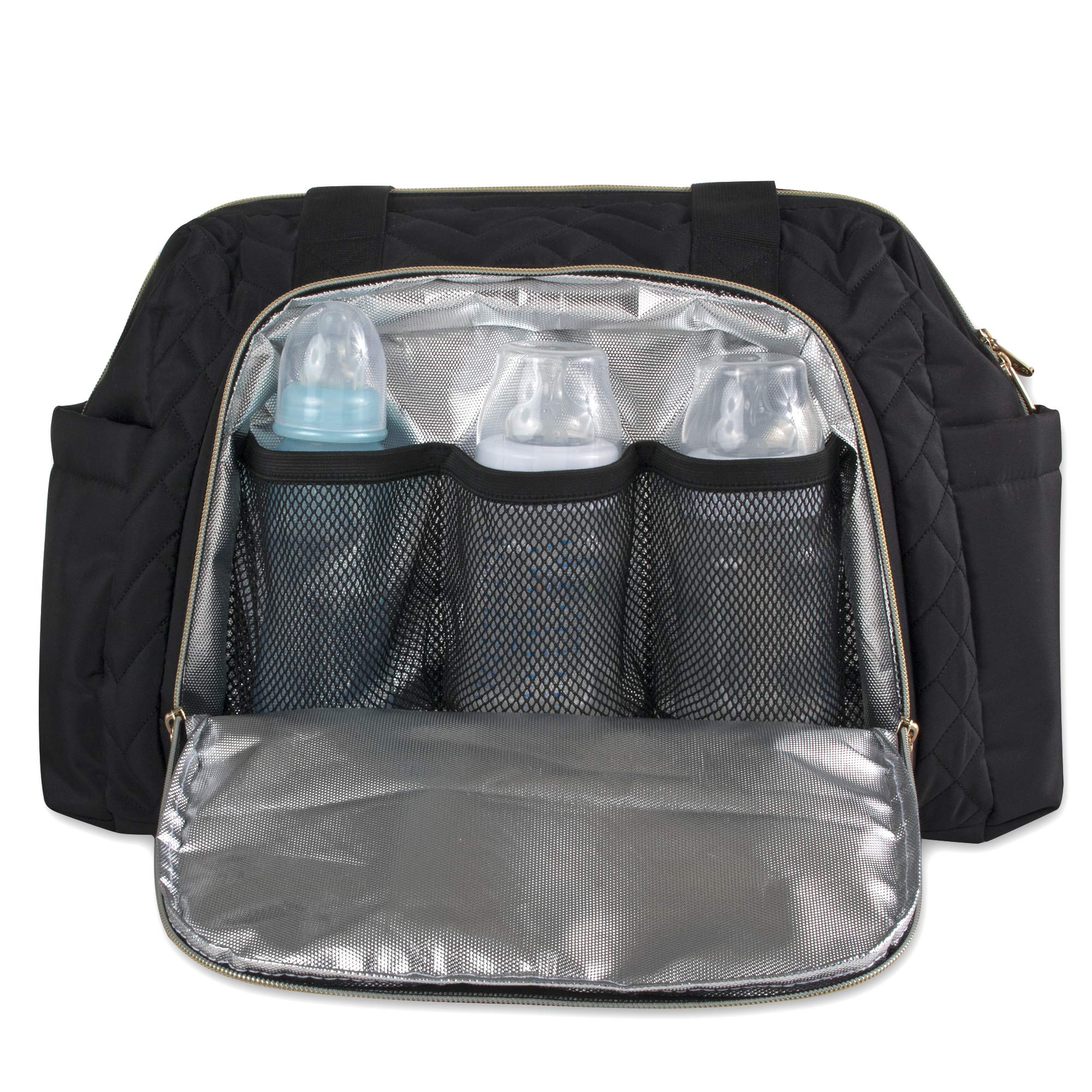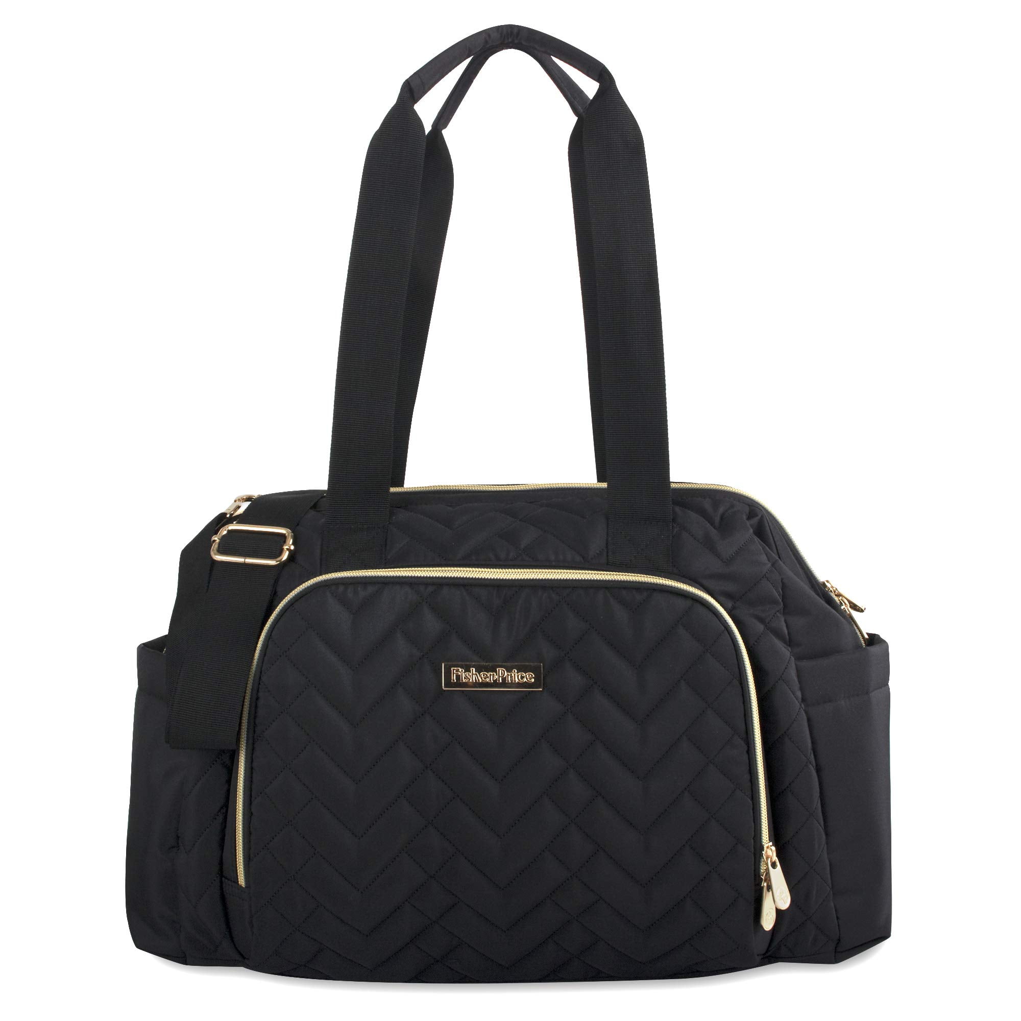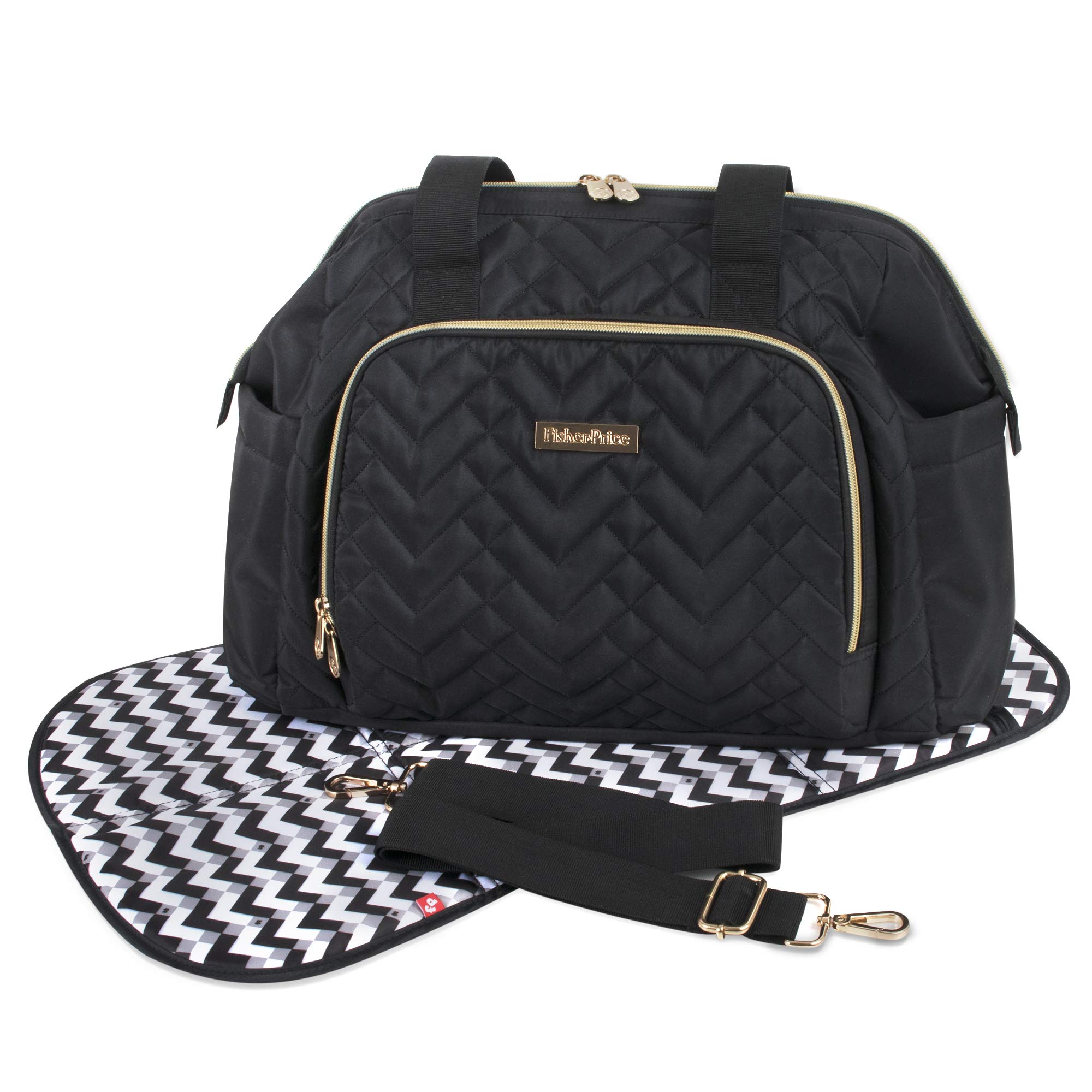 Fisher-Price Harper Quilted Convertible Crossbody Diaper Bag Tote With Shoulder Straps, Removable Luggage Strap, Matching Changing Pad, Insulated Bottle Pockets and Electronics Pocket in Black
