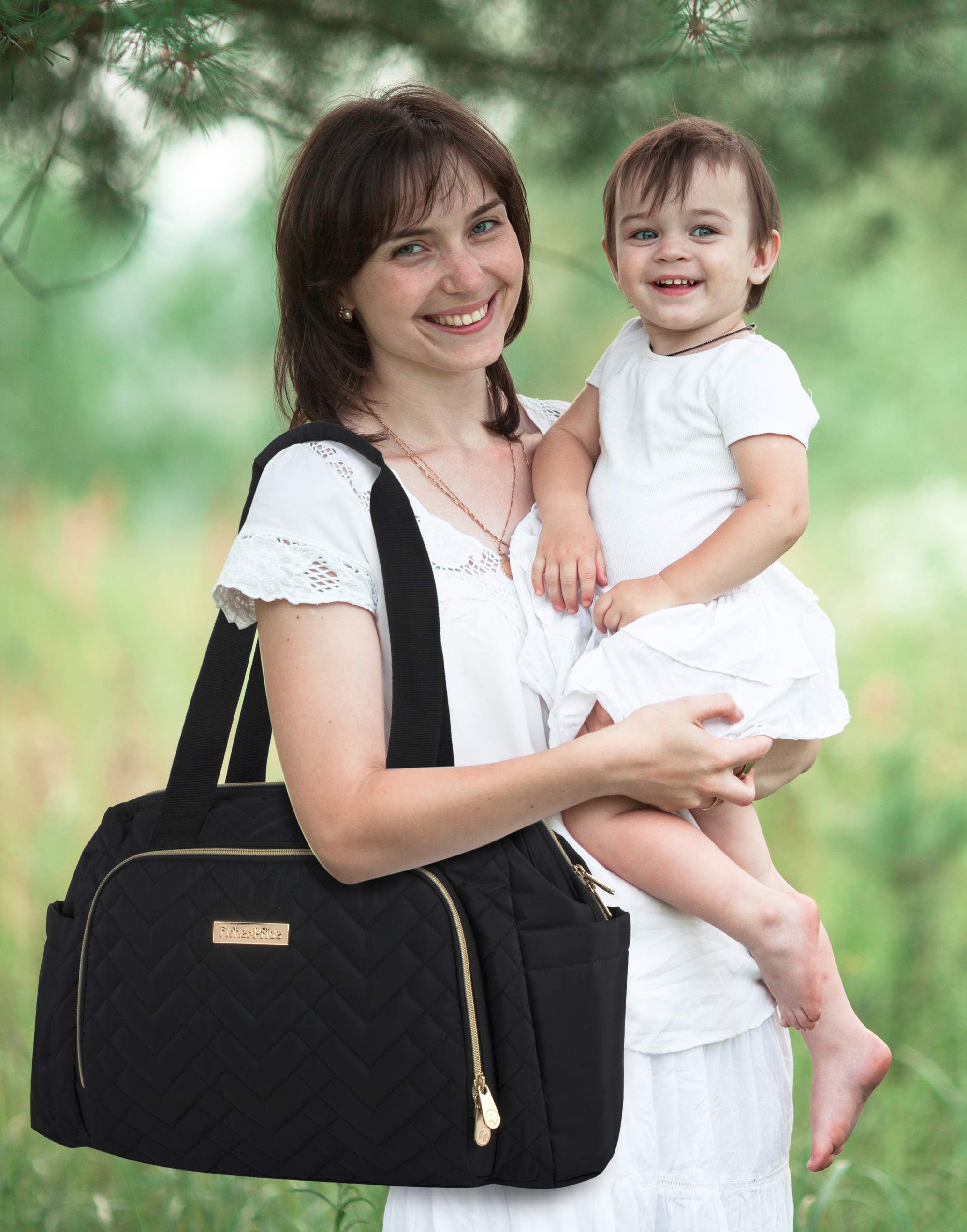12 TOTAL POCKETS: Including front insulated zip pocket that can hold up to (3) baby feeding bottles for keeping warmed or chilled, (1) padded electronics pocket,(2) side pockets for storing baby wipes, baby powder, water bottles, maybe an umbrella and more REMOVABLE WIPE CLEAN FOLDING CHANGING PAD: Protect your baby from any germs or bacteria that may be living within restrooms or on baby changing tables on the go with this removable, wipe-clean folding changing pad to match the interior of the bag. Lightweight, easy to fold and manage, use this convenient changer to also protect fabric surfaces such as the bed or couch and even hard surfaces, but even more importantly, your baby. Just remember to wipe down and sanitize before and/or after each use INCLUDES ADJUSTABLE STROLLER STRAPS: To use them to clasp things to the bag itself as needed for easy access later INCLUDES ELECTRONICS POCKET: Store mom or dad’s electronic tablet or phone device in the padded electronics pocket within the carrier to help avoid accidental cracks or scratches on your mobiles DIMENSIONS AND CARE INSTRUCTIONS: The signature quilted convertible crossbody diaper bag tote measures 17″ L x 15″ W x 7″ H and is made of soft but durable polyester, we recommend hand washing, wiping down, spot cleaning, and air drying this bag’s interior and exterior surfaces Fisher Price: Most loved and trusted by moms the world over