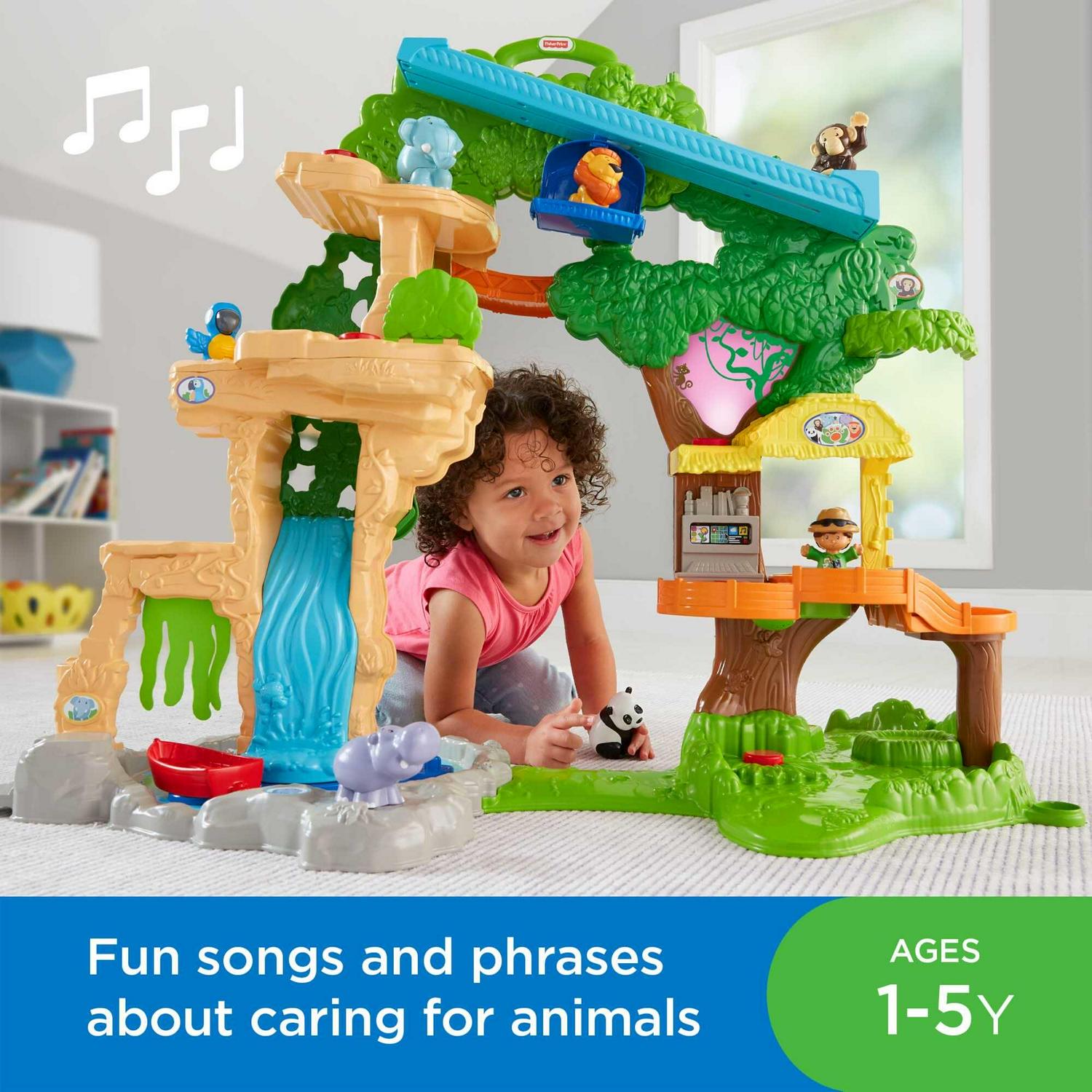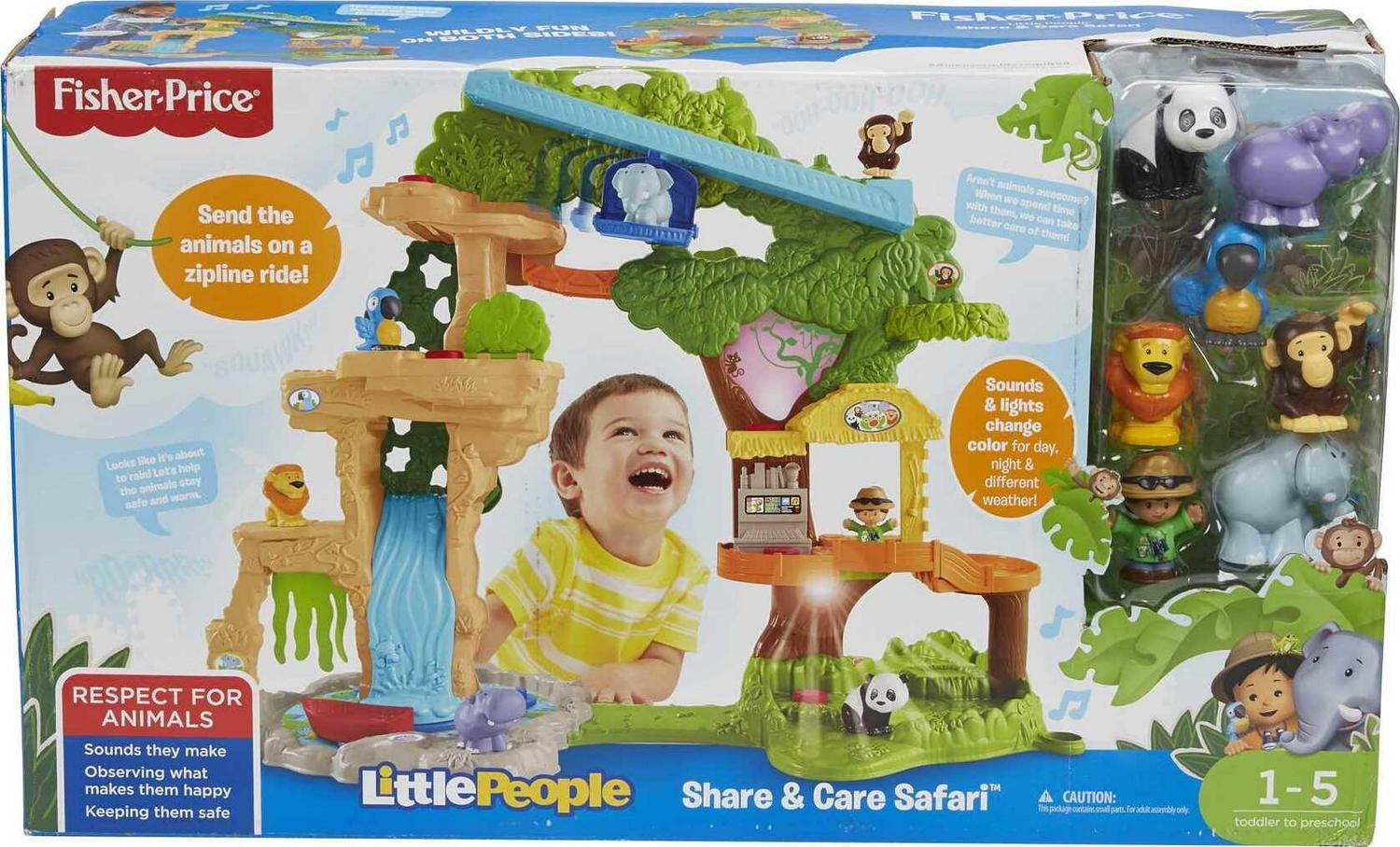 Lions, and hippos, and elephantsoh my! At over 2 feet tall, with two sides of play and a variety of exciting lights, sounds, songs and phrases, the Little People Share & Care Safari playset is loaded with wild fun for your little person to discover. As toddlers explore, the Discovery Buttons bring each area alive with lights, sounds, actions and songs that help kids learn how to care for different animals to make them happy.
