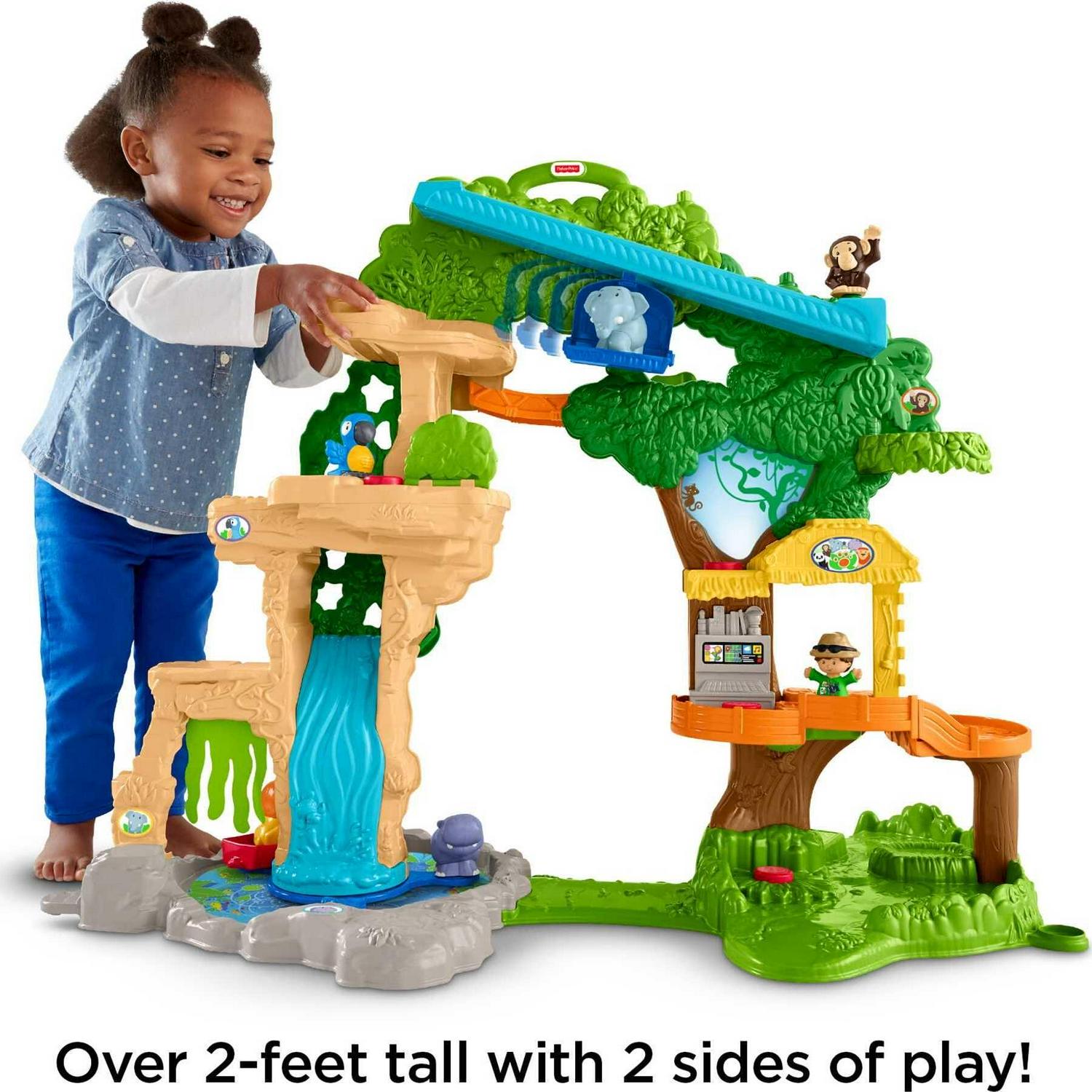 – Pop-up computer screen with animal facts, working zipline, drop-through waterfall, peek-a-boo bush, plus soft vines and spinning water basin