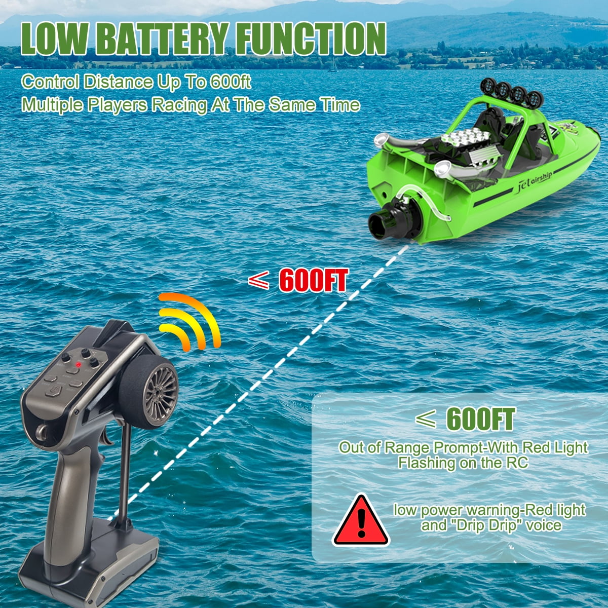 The Racing Speed Boat offers the best racing action for outdoor recreational fun. The Remote Controlled Boat races across the water up to 30 MPH, 2.4GHZ remote control with a 600 Ft signal range. The Non-Capsize Hull System can flip the boat quickly from wave. The turbojet provides the power to sail the sea like a real jet boat.. LED lights allow you identify the position and direction of the boat in the Pools and Lakes at night. Press the autopilot mode button, the hull will automatically move back and forth, bring more fun to children.