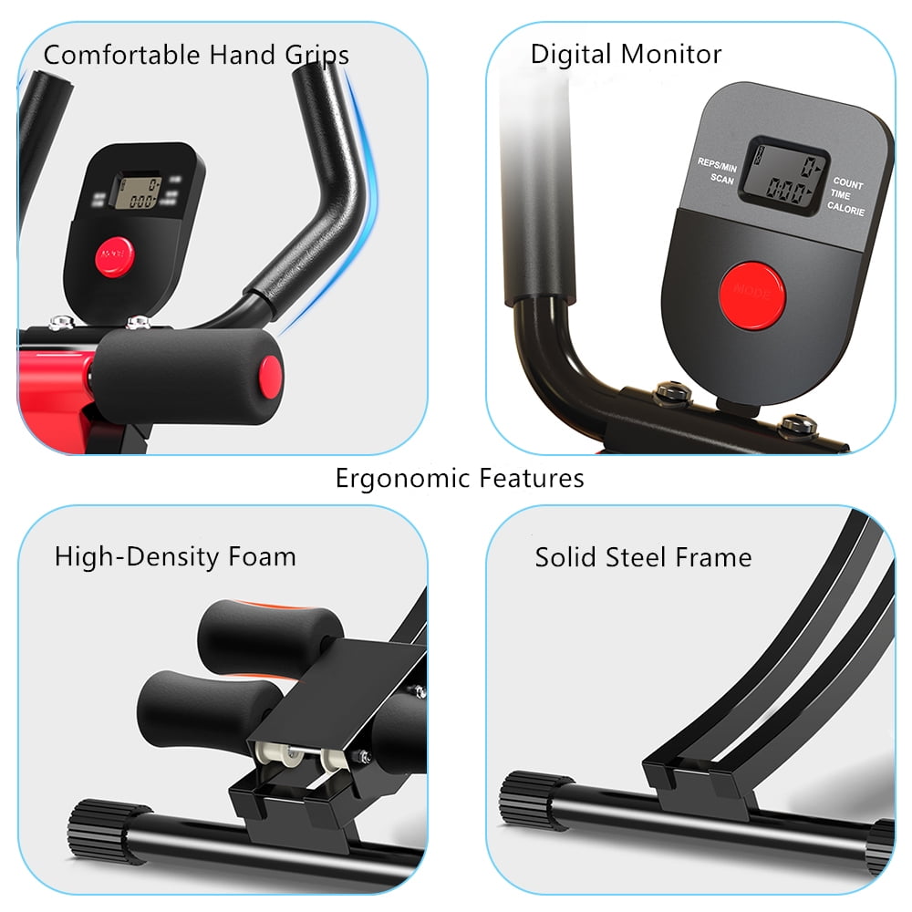 Advanced Ab Workout Machines: This ab exercise equipment has curve track steel design which make your ab workout more effective and challenging which is a perfect workout equipment for home workout. Height Adjustable Core Trainers: 4 different Height levels can be adjusted to meet different levels needs, from beginners to professional athletes this abdominal workout equipment is a must-have one exercise machine. Easy to Install Ab Trainer: With the help of our clear and brief set up instruction, you can set up this abdominal exercise machine less than 5mins, and we promise it will become your favorite in your exercise & fitness home gyms. Stable and Comfortable Ab Coaster: This workout machine made of heavy-duty steel frame, high quality knee cushion and Foam-covered handgrips, ensure high durability and comfortable workout. LCD Display: The smart LCD training monitor circularly shows the calories burnt, workout time and repetitions, which make this Abdominal Exercise Tools more intelligent. Effective, Comfy, Stable, Space-Saving|Comfortable Hand Grips, High-Density Foam, Digital Monitor, Ergonomic Features, Solid Steel Frame