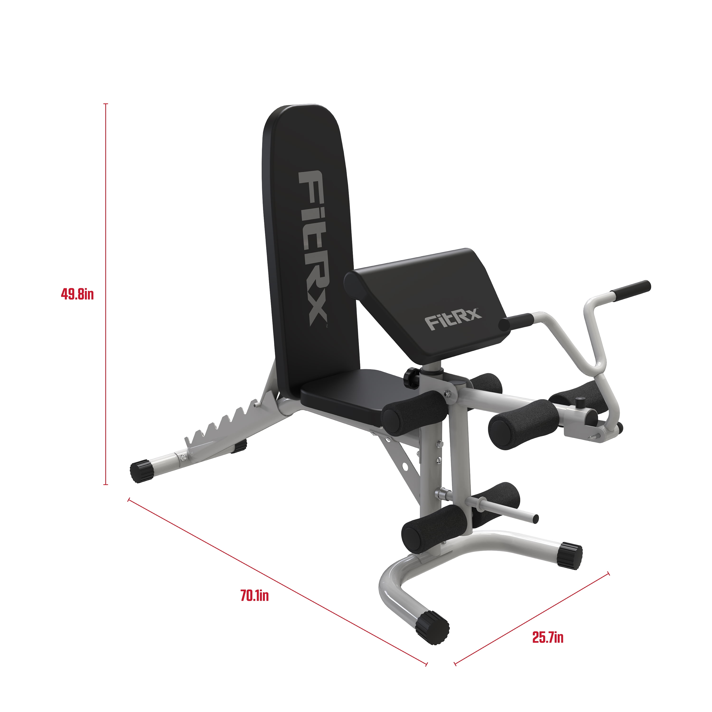 FitRx Weight bench with adjustable backrest for flat or inclined positions Heavy-duty iron construction for durability; holds up to 390 lbs. (including user) Removable curl bar Leg lever for calf curls and leg extensions Cushioned foam padding and tubing offers comfort for all exercises: bench press, leg curls and more Compact design makes for the perfect home gym equipment Dims: 49.8 x 25.7 x 70.1 in., 35 lbs.