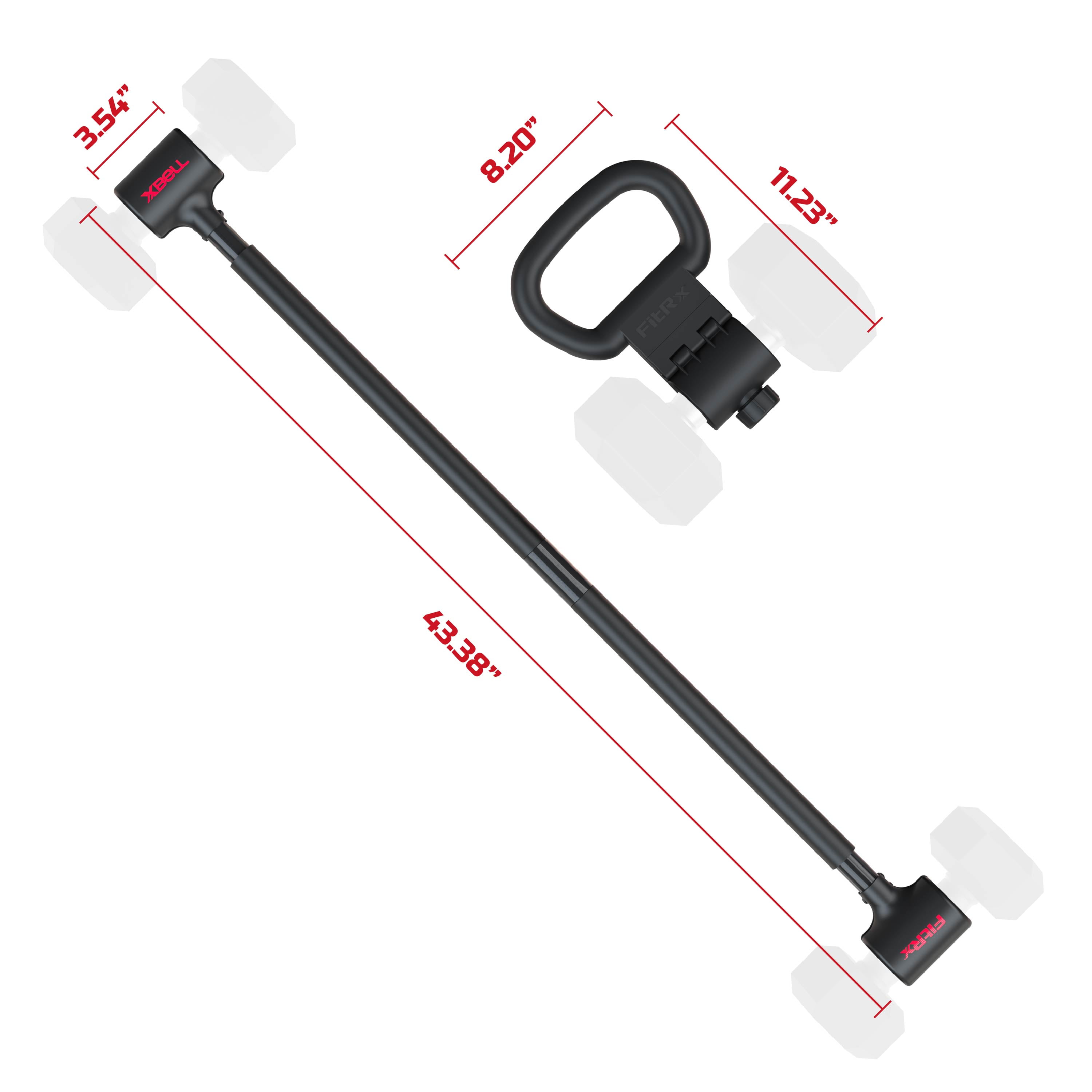 FitRx X-Bell System Dumbbells to Barbell Converter, Dumbbell to Curl Bar and Kettlebell Handle Turn dumbbells into 30in. straight barbell, macebell, or kettlebell Dumbbell bar with simple screw down system keeps your weights secure Adds 12+ workouts to your exercise regimen Supports up to 90lbs of weight on each side Fits most dumbbells with 1.5in max handle diameter Space-saving design is the perfect addition to any home gym