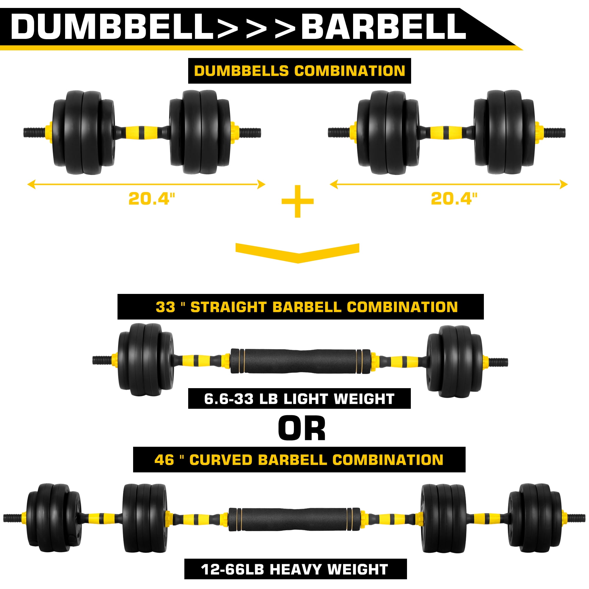 FIXTECH 66 Lbs Adjustable Weight Dumbbell Barbell Set, 4-In-1 Free Weight Combination with Curved Bar Connector for Women Men Workout Fitness, Yellow