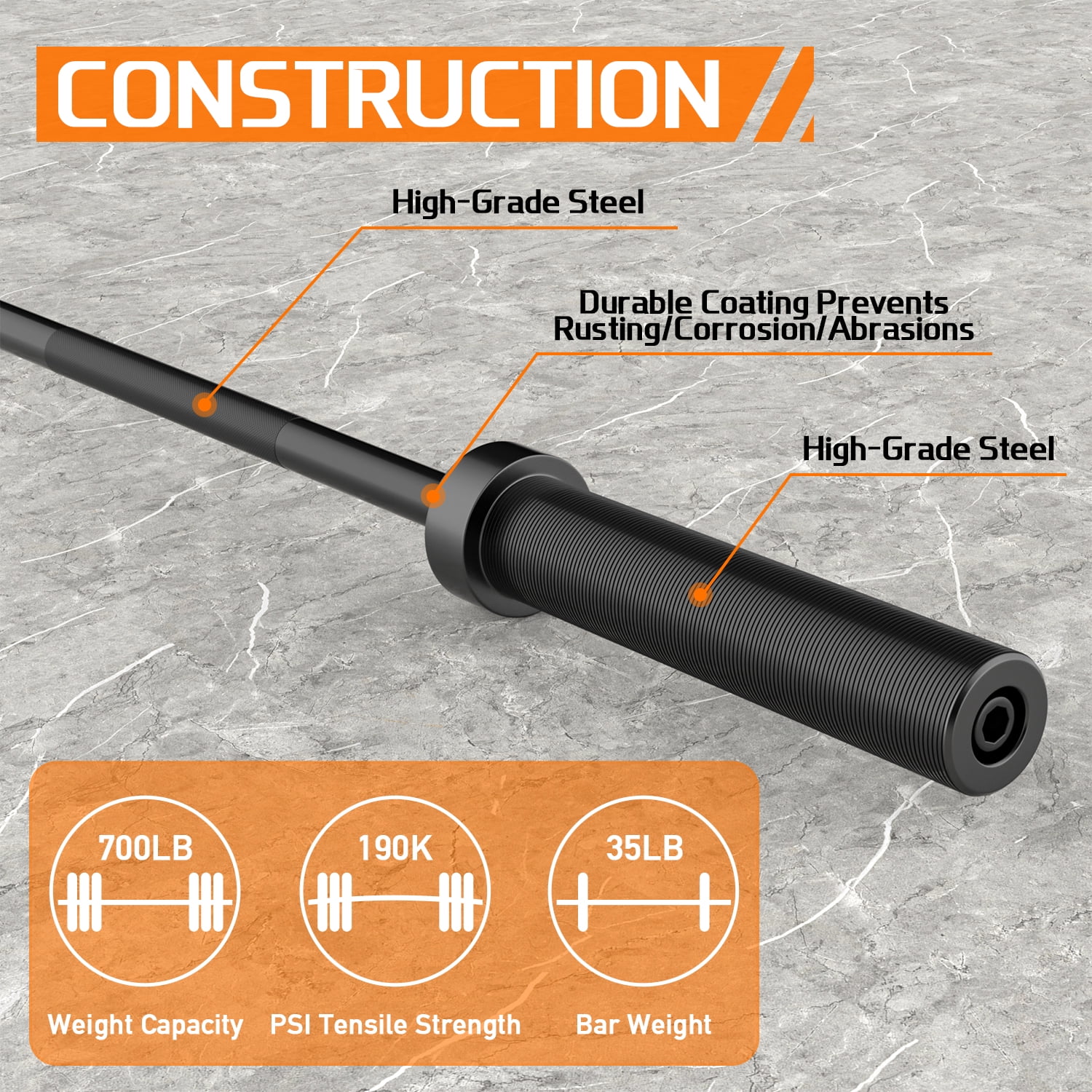 【Rugged & Durable Structure】Olympic weightlifting bar is made exclusively from high-grade steel and a hard chrome finish for unmatched oxidation resistance and repeated use. 190000 PSI high tensile strength shaft can accommodate your aggressive training regimen. And it will not rust and deform within 3 year after normal use. 【Knurled Handles Design】This Olympic weight bar adopts the knurled handles for improving grip. These knurls not only increase friction, but also have anti-slip properties. Besides, they can increase the safety of your exercises and ensure a comfortable, consistent feel during sets. 【Sufficient Length & Weight】This bar is very heavy, 86” long. Sufficient length allows you to do more movements, and a certain weight can help you build muscle. This bar is really the great option for you to do the strength training. 【Wide Range Of Workouts】The superior design of our Olympic bar allows for a wide variety of workouts such as bench presses, bicep curling, piggybacking, overhead pressure or lunge. You can use it at home or take it to the gym for exercise to exercise muscles and relieve stress. 【Buy With Confidence】700 pounds weight capacity; Each Barbell is carefully tested and straightened to create just the right amount of “whip” or “flex” that is needed for Olympic lifting.
