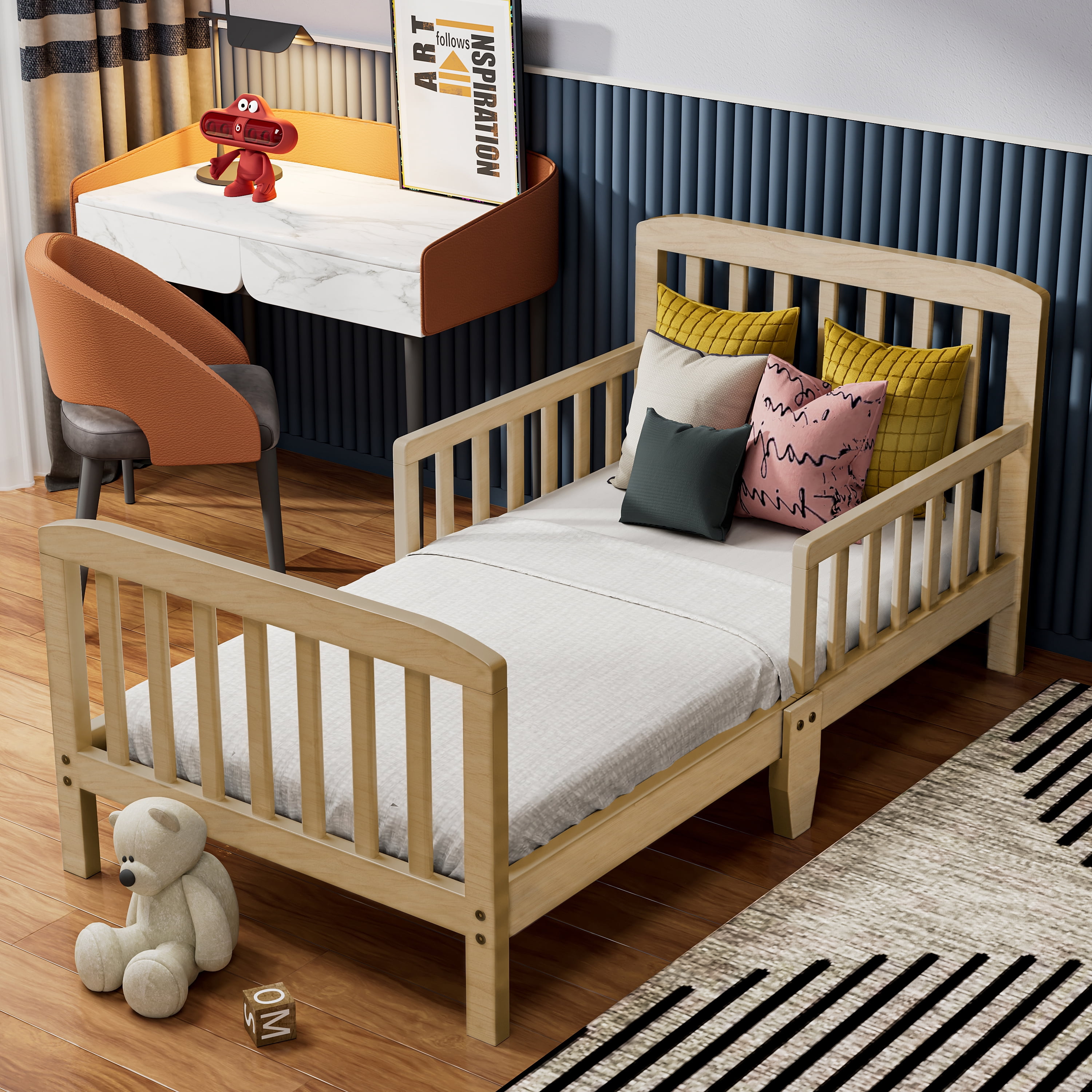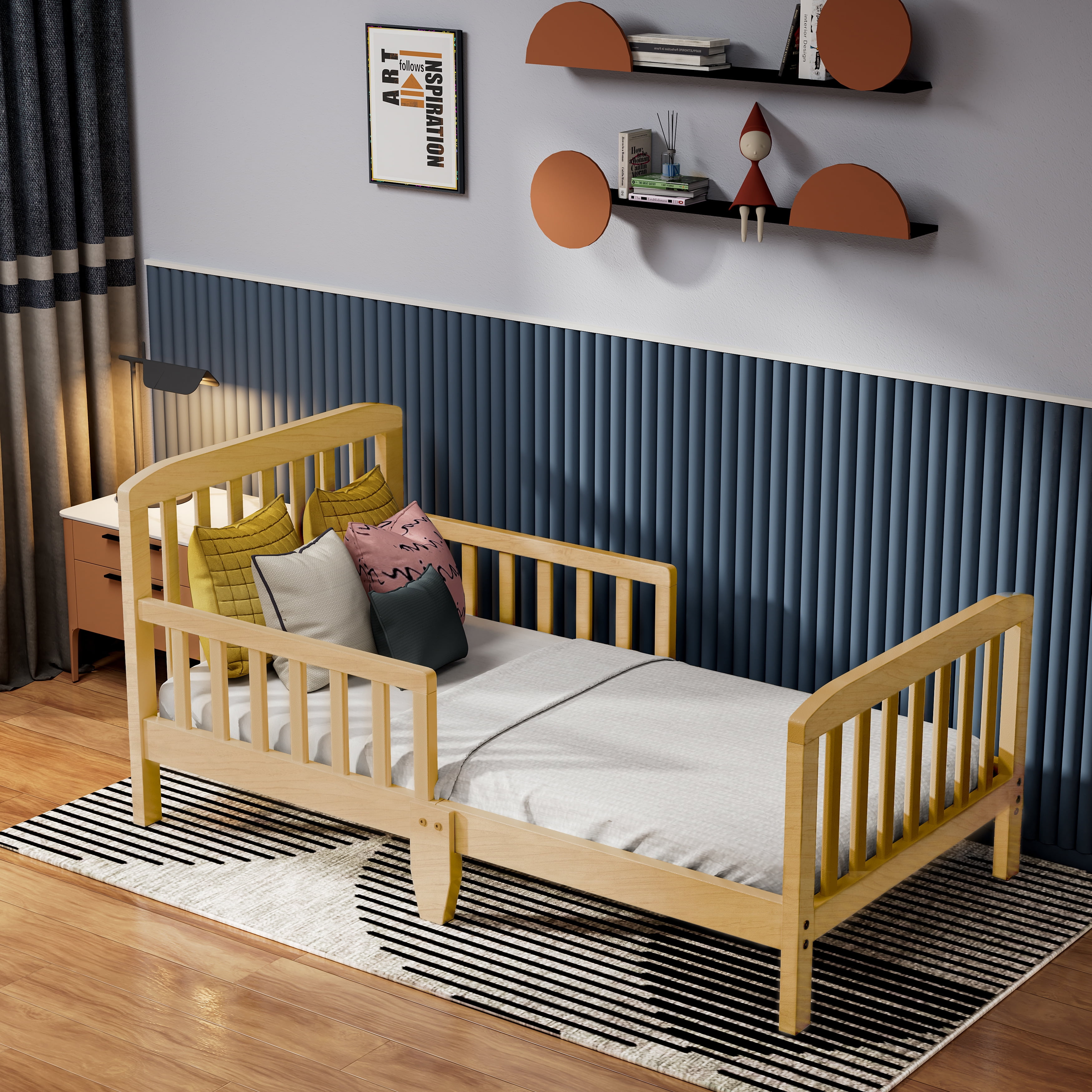 Classic toddler bed frame (natural) Kid-safe guardrails for secure sleep 7 cross slats and a center leg for support Easy assembly and lightweight design Weight capacity of up to 38 pounds