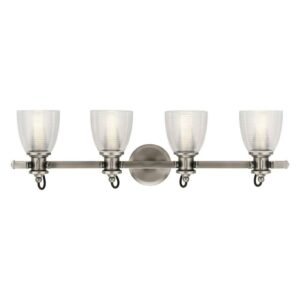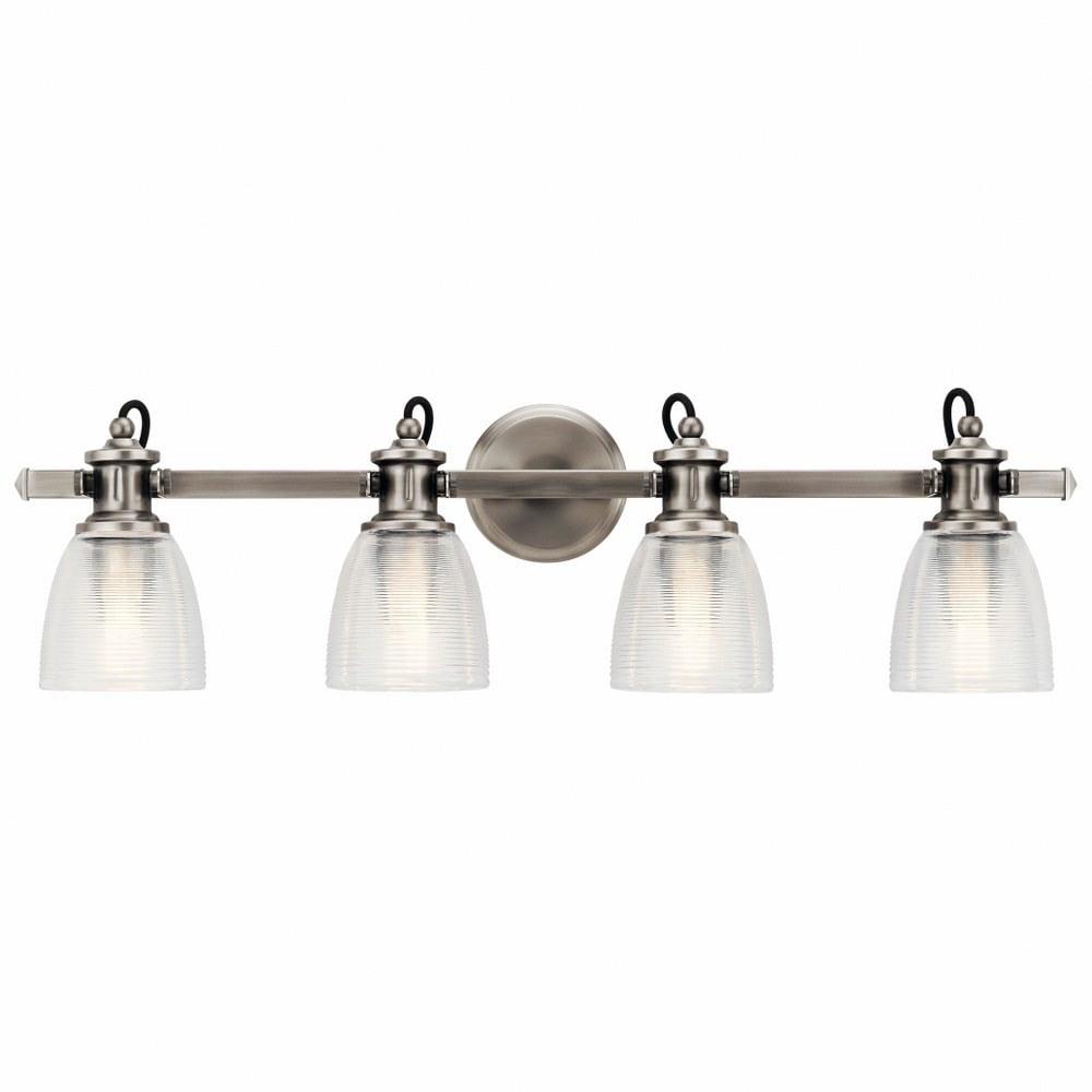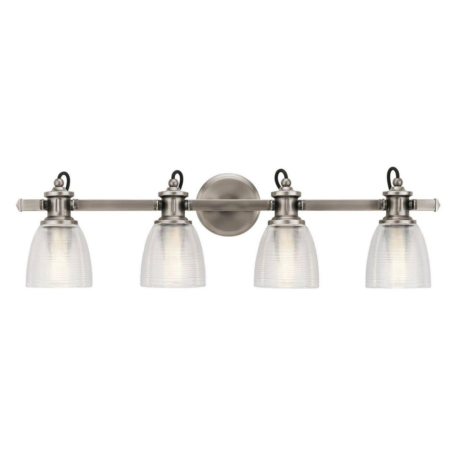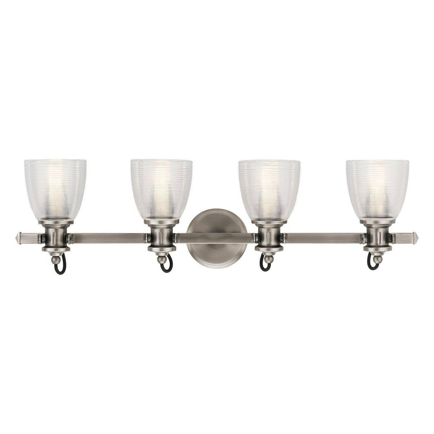 Kichler Lighting-45874CLP-Collection: Flagship, Material: Steel, Finish Color: Classic Pewter, Width: 32.5″, Height: 9.5″, Depth: 7″, Height From Outlet Box: 2.5″, Backplate Width: 5″, Lamping Type: Incandescent, Number Of Bulbs: 4, Wattage: 75 Watts, Dimmable: No, Moisture Rating: Damp Rated, Desc: The Flagship(Tm) Collection 4-Light Bath Light Offers A Nautical-Inspired Look That Doesn’T Overlook The Details. Ribbed And Textured Glass Shades, Exposed Black Cords And Mechanical Supports Blend To Add Interest. Back Plate Width: 5.00. ,-Flagship – 4 Light Bath Vanity Approved For Damp Locations – With Coastal Inspirations – 9.5 Inches Tall By 32.5 Inches Wide