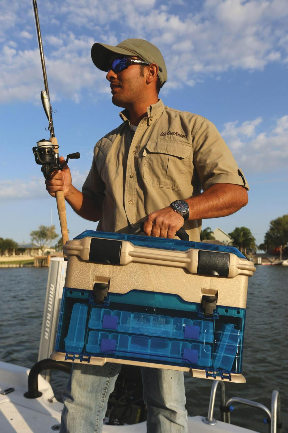 – Flip-top lid yields quick access to 7 tackle storage compartments