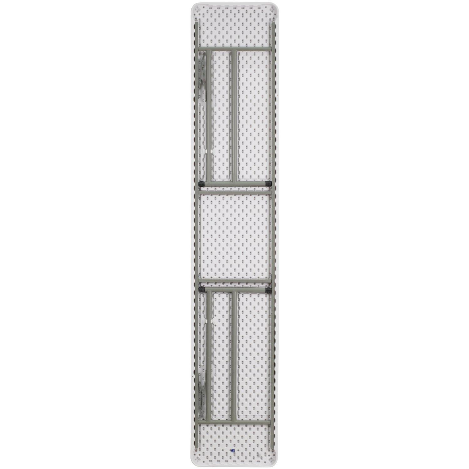 If you are in the market for a truly multi-functional table look no further. Use as extra dining surface for the holidays, a place to hold your sewing machine, indoor plants, pamphlets in your reception area or for your next seminar. This rectangular folding table is 8 feet long and can seat up to four adults making it beneficial in a multitude of settings that include the classroom, sewing room, solarium, banquet halls and in training rooms. The space saving design can allow multiple tables in a small to large setting making it the perfect style table for virtually any use. The durable blow molded top is low maintenance and cleans easily. This table has extendable feet that provide a stable work surface and the legs fold under the table to make storage more convenient and for better portability.