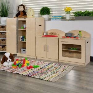– Make believe kitchen set ideal for play rooms or classrooms, natural finish can be cleaned with alcohol disinfectant then cloth dry
